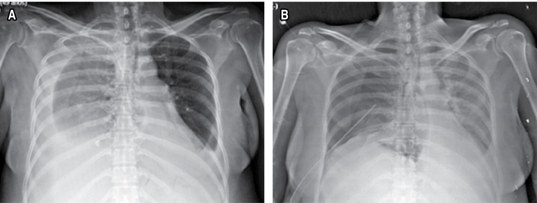 She was sent to our service on 10-27-19, receiving 85% oximetry and anasarca; a chest teleradiography was performed on admission, showing evidence of right pleural effusion of approximately 40%, placing a water seal in the sixth intercostal space with right axillary midline and verifying its placement with a control chest X-ray that ensures the placement of the probe, proposing an exploratory laparotomy on 10-29-19 (Figure 3).