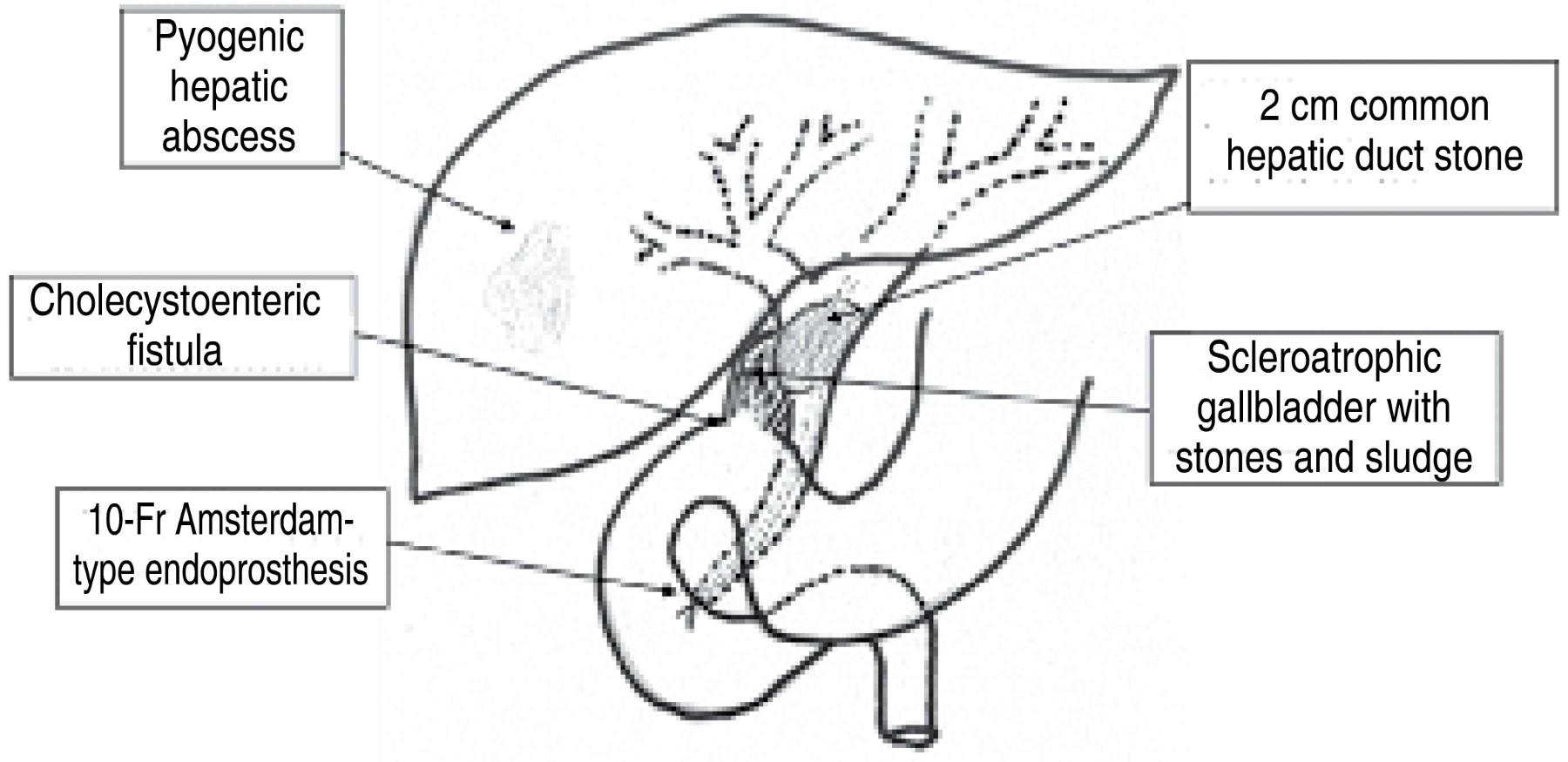 The presence of pyogenic hepatic abscesses secondary to the cholangitis that the patient developed due to the obstruction of the biliary tree due to the migrated liths from a scleroatrophic vesicle and duodenal fistula is noteworthy. Punctual treatment required combined medical, radiological, endoscopic, and surgical procedures for the solution of SM type V and hepatic abscesses, involving a Hepp-type biliodigestive shunt and USG and CT guided punctures for the drainage of the abscesses in addition to antibiotic therapy according to culture reports, to achieve the therapeutic goal.