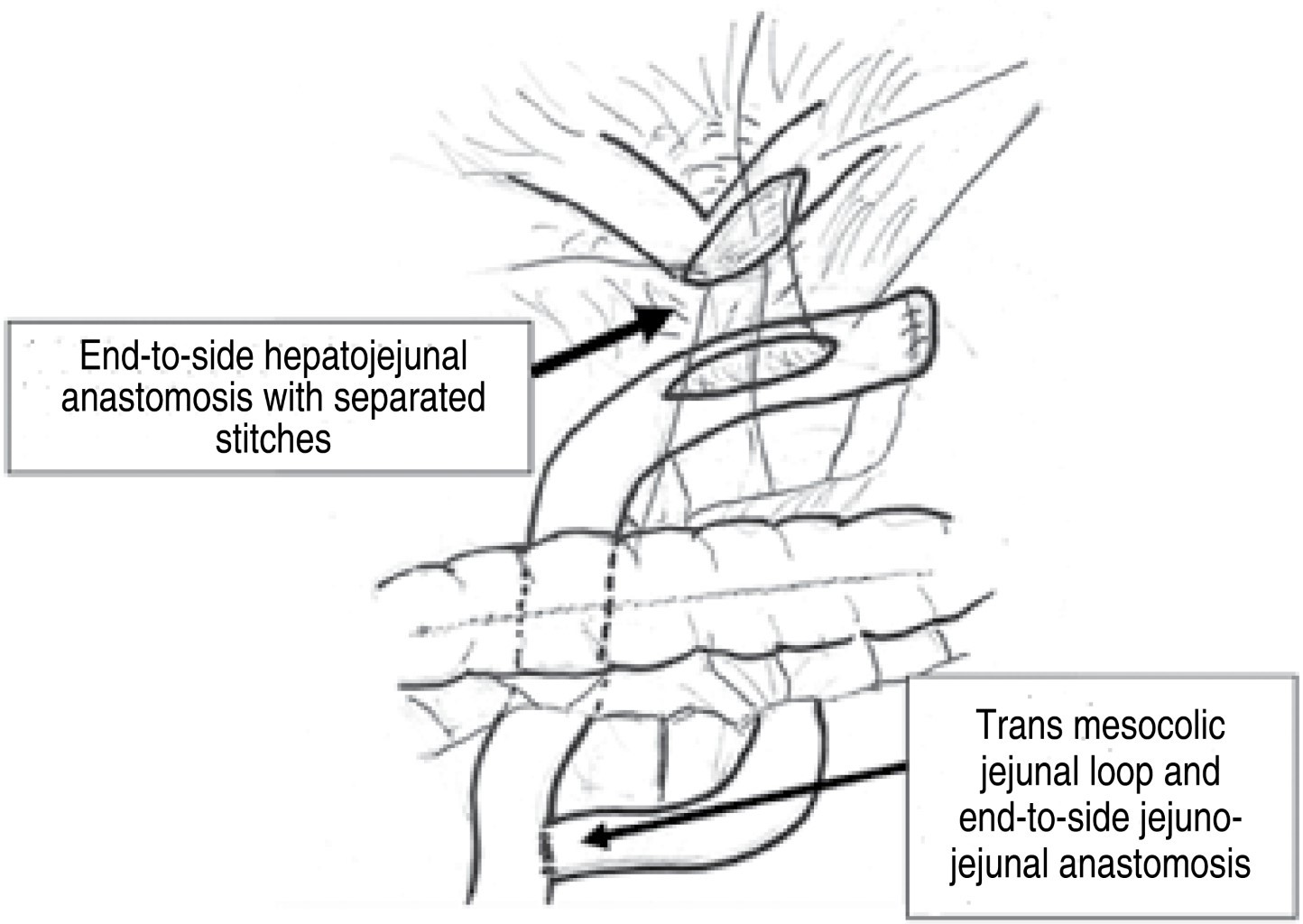 When dissecting the plastron, the scleroatrophic gallbladder is opened over the palpated litho; the Amsterdam prosthesis is extracted from the interior of the main biliary tract, together with a 2 cm litho embedded in the common hepatic, resulting in a 2 cm defect involving the common hepatic and partially the left hepatic duct, A 3 mm fistulous orifice from the vesicular remnant to the duodenal knee, it was decided to close the cholecystoduodenal fistula with a 2-0 polypropylene loop and three separate polypropylene stitches on top of the loop, curative biliodigestive bypass from the jejunum to the common hepatic in a single mouth with the left hepatic (Hepp's technique) in "golf club" with separate stitches and 10 ml of fibrin sealant around the anastomosis, ending the jejunum-jejunal Roux-en-Y at 40 cm from the biliodigestive bypass in a transmesocolic way, fixing the jejunal loop to the mesocolon with separate 3-0 polypropylene stitches (Figure 5).