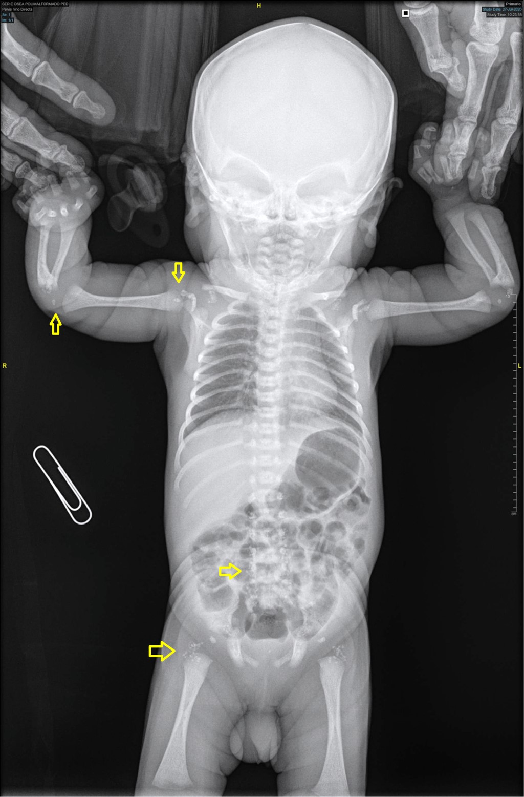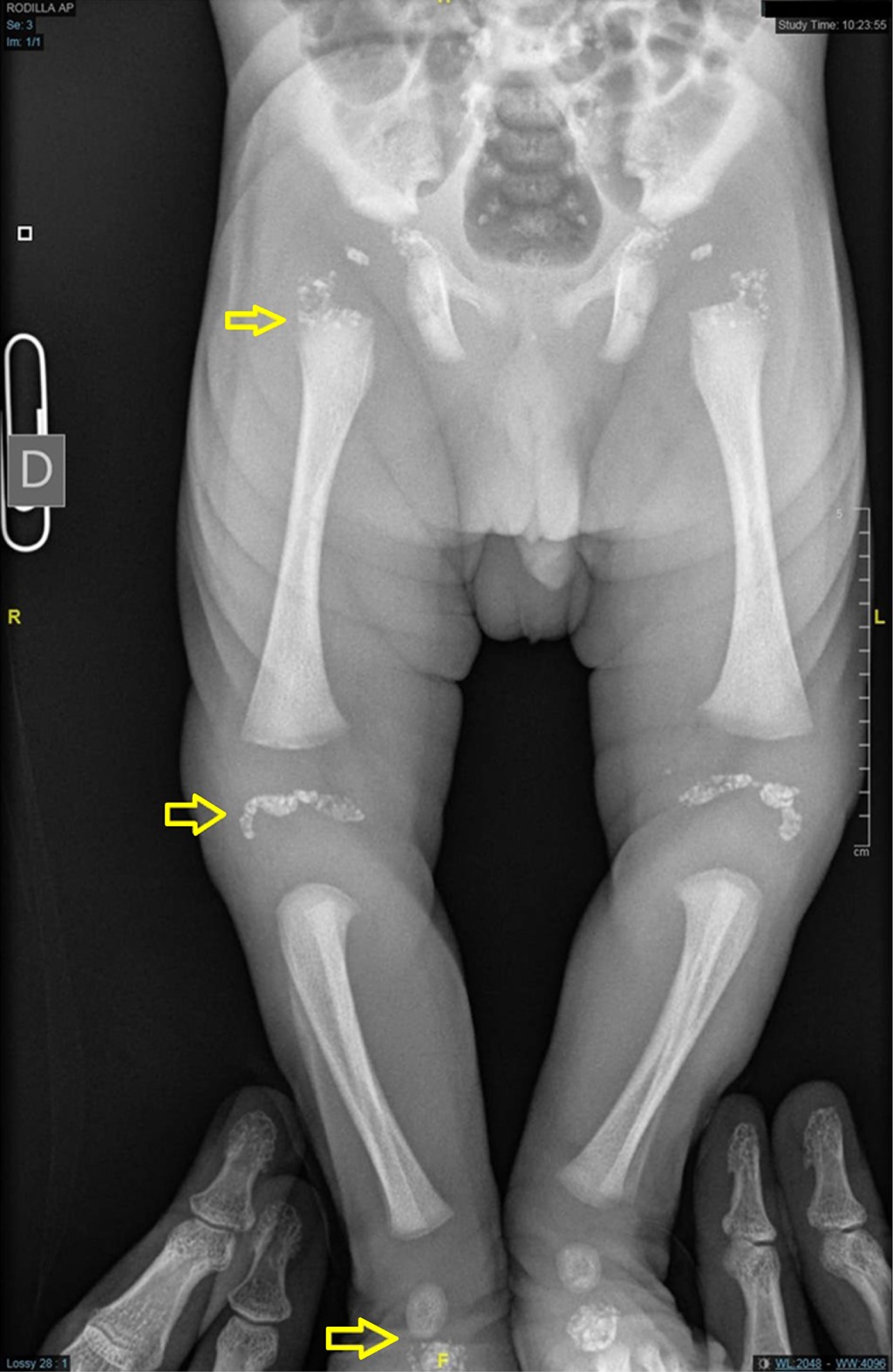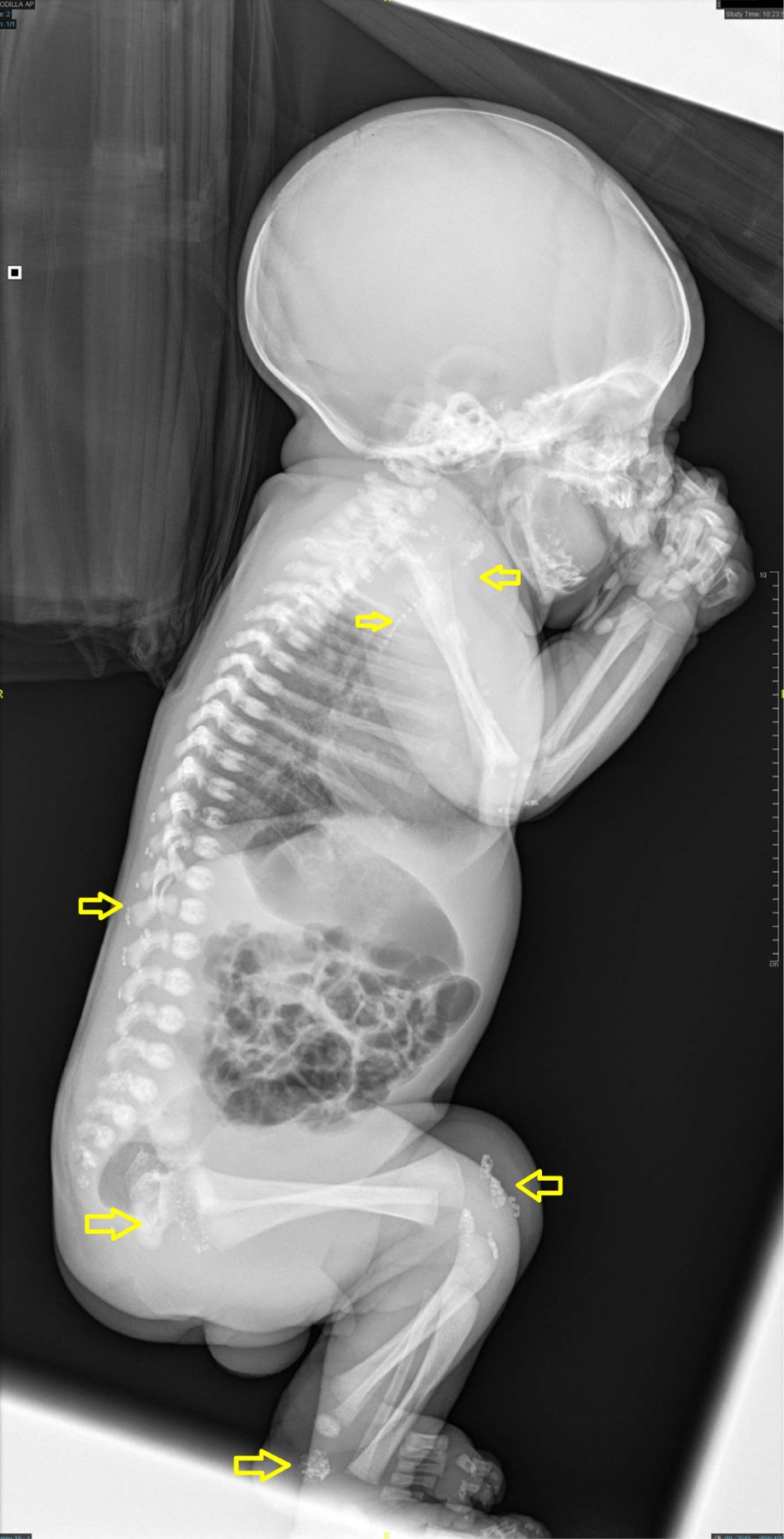 We present the radiographic images of a newborn in whom a diagnosis of chondrodysplasia punctata was reached. Patients with this disorder have pinpoint calcifications in multiple joints.