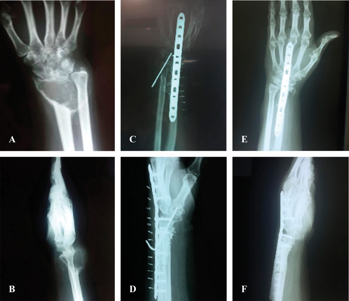 Salunke AA, Shah J, Warikoo V, Chakraborty A, Pokharkar H, Chen Y, et al. Giant cell tumor of distal radius treated with ulnar translocation and wrist arthrodesis. J Orthop Surg (Hong Kong). 2017; 25(1): 2309499016684972.