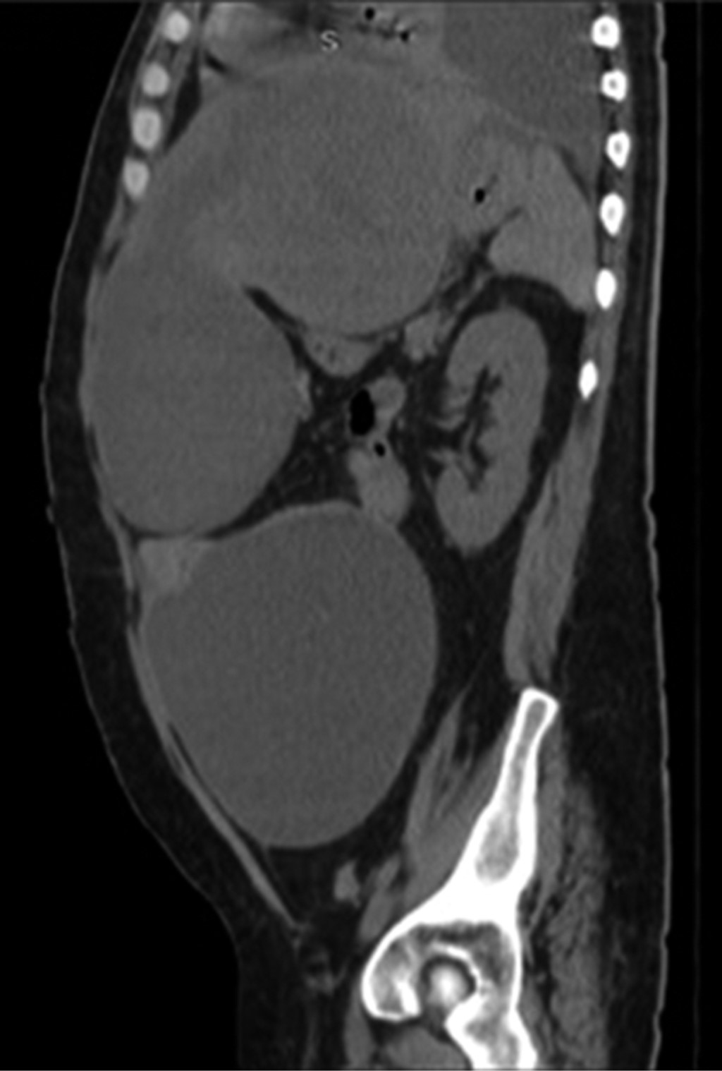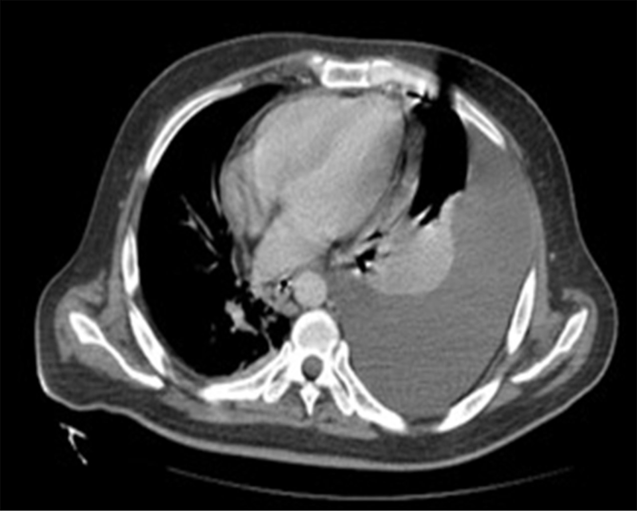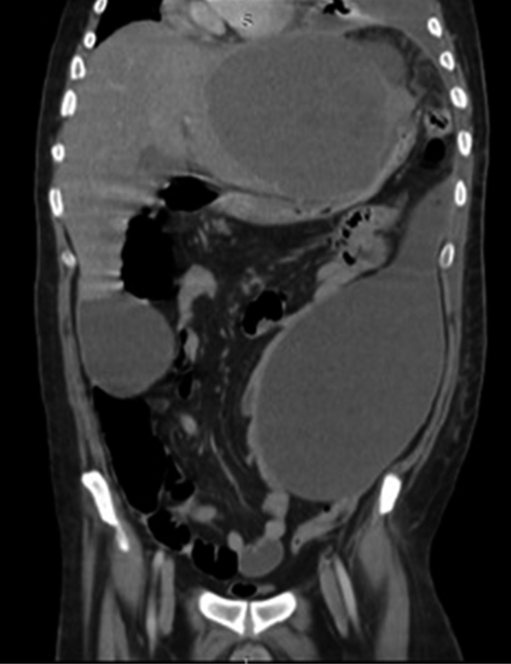 An anteroposterior (AP) chest X-ray was performed, in which a left pleural effusion covering more than 50% was visualized. A computed tomography scan showed a significant amount of fluid in the left pleural space that conditioned a passive atelectasis of the lower lobe (Figure 1); the liver was found with heterogeneous density with an increase of the left hepatic lobe secondary to the presence of a heterogeneous hypodense lesion with lobulated borders, showing peripheral reinforcement and some internal septa covering segments II, III, IVa, and IVb measuring approximately 20 × 14.5 × 12.5 cm (Figure 2), conditioning posterior displacement and compression of the stomach and pancreas and caudal displacement of the intestinal loops (Figures 3 and 4). In the lower pole of the right hepatic lobe adjacent to segment IV, a homogeneous cystic lesion with peripheral enhancement was identified after intravenous contrast administration, measuring 25 × 27 × 13 cm in its major axes. A Foley tube and nasogastric tube were placed as initial management draining a liquid of gastric characteristics (30 ml). A central catheter was placed and verified by radiography. Imaging studies were requested. Fasting was ordered and fluid therapy, antibiotic therapy with ceftriaxone and metronidazole, pain management, glycemic control, and gastric protection were started. When visualizing the image of the left pleural effusion, it was decided to perform a thoracentesis, obtaining a thick exudate with a chocolate appearance. When the tomography was available, urgent surgical treatment was performed.