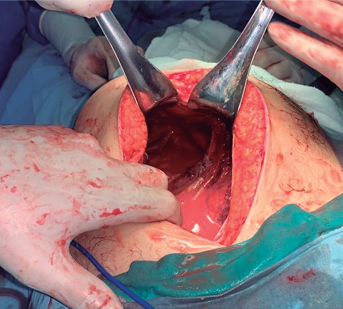 Through a left endo-pleural probe one liter of serous fluid with serous characteristics was obtained. During the surgery, a ruptured hepatic abscess was found in the peritoneal cavity, obtaining about three liters of purulent hematic liquid with the appearance of "anchovy paste" (Figure 5). The abscess capsule located in the left hepatic lobe segments 2, 3, and 4, approximately 10 cm in diameter, was visualized as extending towards the diaphragm without invading it (Figure 6). Exhaustive lavage of the peritoneal cavity was performed without finding any involvement of neighboring organs. A Saratoga drainage directed to the abscess capsule and Penrose drainage directed to the pelvic cavity (Figures 5, 7 and 8) was placed.