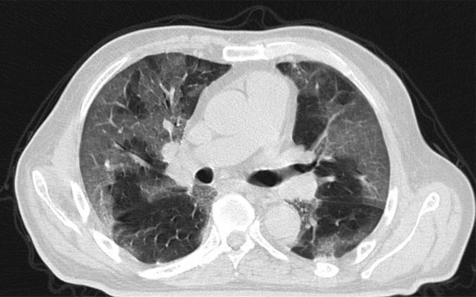 A 69-year-old male patient with a history of type 2 diabetes mellitus was treated with metformin and chlorpropamide. He also had hypertension treated with losartan and amlodipine. He presented to the emergency department with headache, chest pain, cough, myalgias, arthralgias, and dyspnea of one-week evolution. On admission, his heart rate was 114 bpm, respiratory rate 24 rpm, oxygen saturation 80% without supplemental oxygen support; his glucose was 587 mg/dl, white blood cells 25,690 cells/mm3, neutrophils 85%, lymphocytes 1.2%, hemoglobin 16.3 g/dl, procalcitonin 3.78 ng/dl, arterial blood gas with a pH of 7.41, pCO2 21 mmHg, PO2 35 mmHg, HCO3 13 mmol/l, oxygen saturation 62%. A rapid antigen test for SARS-CoV-2 was performed, and the result was positive; a CT scan of the chest showed radiological data suggestive of SARS-CoV-2 infection (Figure 1), and management with supplemental oxygen, insulin infusion pump, carbapenem antibiotics, antihypertensives, dexamethasone, and antithrombotic prophylaxis with enoxaparin was started. 48 hours after admission, the patient continued with septic shock, so vasopressor amines were started; an orotracheal intubation was performed and support with invasive mechanical ventilation was initiated. A nasogastric tube (NGT) was placed. After 24 hours of its placement, he presented hematemesis accompanied by abdominal distension, leukocytosis of 40,000 cells/mm3. A simple abdominopelvic CAT scan was performed, which revealed gastric pneumatosis and pneumoperitoneum (Figure 2). An urgent exploratory laparotomy was performed finding necrosis of the greater curvature of the stomach. A vertical gastrectomy was performed with GIA stapler with purple cartridges of 45 and 60 mm (Figure 3); the stapling line was reinforced with continuous a Prolene suture 00; a feeding jejunostomy tube was placed at 60 cm from the Treitz angle and Saratoga drains were left in place. Twenty-four hours later, the patient had hemodynamic stability, vasopressor amines were suspended, and enteral nutrition with an elemental diet was started. On the fifth postoperative day, the patient showed adequate tolerance to the enteral diet through jejunostomy. The methylene blue test was performed through the nasogastric tube showing no evidence of leaks; the white blood cell count decreased to 24,000 cells/mm3. Histopathology results were obtained revealing pan mural necrosis associated with arterial thrombosis secondary to microorganisms compatible with Mucor sp.; therefore, management with amphotericin B was initiated (Figures 4 and 5). During follow-up he showed good evolution; an abdominopelvic CT scan with contrast by the nasogastric tube was performed, which ruled out leaks and intra-abdominal collections and corroborated the integrity of the gastric wall; drains were removed, and the patient was discharged from general surgery on day 9 post-surgery, continuing to be managed by the internal medicine service. During the following days of hospitalization, the patient presented cardiovascular and pulmonary deterioration; a urine culture was taken, which showed growing of Candida tropicalis, and a CAT scan of the skull, thorax, and abdominopelvic with oral contrast was performed (Figures 6 and 7), The patient continued without evidence of abdominal leaks, rhino-cerebral and pulmonary mucormycosis were ruled out. A probable superimposed bacterial pneumonia and interstitial pneumopathy secondary to COVID-19 were reported. He showed persistent clinical deterioration and refractory shock and 29 days after admission.