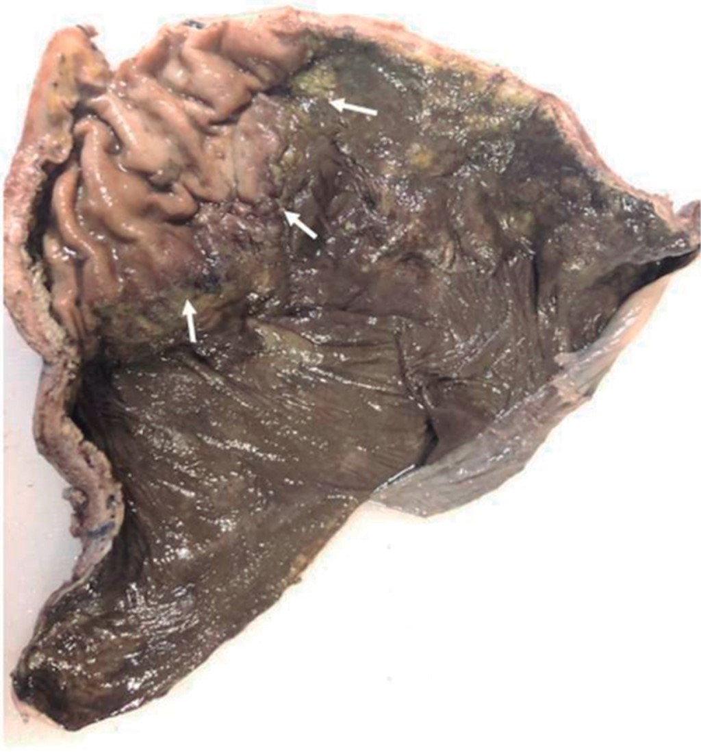 Mucormycosis is an emerging infection caused by fungi belonging to the order Mucorales;1 it occurs mainly in patients with immunosuppression such as hematologic malignancy, hematopoietic stem cell or solid organ transplantation, and diabetes mellitus;2 In this context, patients with COVID-19 may have an altered cell-mediated immune response and increased susceptibility to fungal co-infections.3 The disease is characterized by extensive necrotizing vasculitis, resulting in thrombosis and subsequent tissue infarction. Primary gastrointestinal disease is the rarest form, with the stomach being the most common site of infection. It can be acquired by ingesting contaminated food but can also be associated with contaminated healthcare-associated devices. Diagnosis may be suspected by endoscopic findings showing a fungal mass or necrotic lesions overlying an ulcerated area; radiological findings are nonspecific.3 Early diagnosis helps to accelerate antifungal therapy and improve survival; liposomal amphotericin B is the treatment of choice. Surgical debridement or complete resection of the affected organ is of utmost importance to eliminate necrosis and improve penetration of antifungal agents into the target site; these patients are at high risk of perforation and bleeding, which requires extensive surgical resection.4 We reviewed the literature in databases such as Wiley and PubMed using the keywords mucormycosis, COVID, and infection. We found very few case reports of fungal disease associated with COVID-19 and no reports when searching for the association between the words gastric, mucormycosis, and COVID.