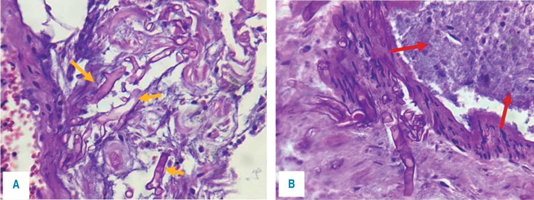 Mucormycosis is an invasive fungal infection with high mortality; its incidence has increased in recent years due to the increase in the population at risk of infection and the improvement in diagnostic tools. It was first described at the pulmonary level in 1876 by Furbringer.5 It occurs mainly in the context of an immunocompromised patient.1 Mortality varies from 32 to 70%; the localized infection is associated with better survival; 6 It is usually diagnosed antemortem in only 25% of cases. In their review of 31 cases, Dioverti et al. report a predominance of male sex (61%) and a mean age of 47 years; 52% of the cases occurred in patients with a solid organ transplant, and 35% were patients undergoing chemotherapy for hematologic malignancy. All the patients had at least one comorbidity, with neutropenia being the most common finding.2 It has been described in patients with severe malnutrition and the use of corticosteroids, but also in patients without any predisposing factor.7 In our case, the patient had multiple risk factors already described such as decompensated type 2 diabetes mellitus, acute coronavirus infection, and steroid therapy initiated to manage COVID-19. The only factor that improved the prognosis was the focal infection in the stomach. The disease is characterized by extensive necrotizing vasculitis with arterial thrombosis and tissue infarction1 and a pathognomonic presence of non-septate right-angled branching hyphae in tissues.8 The genus Rhizopus is the most frequently isolated.9 Other known risk factors include hyperglycemia and acidosis, as they cause leukocyte dysfunction of neutrophils and macrophages, affecting their chemotaxis.10 Six different clinical syndromes can occur, with rhino-orbit-cerebral and pulmonary infection being the most frequent and gastrointestinal infection the least common. Gastrointestinal infection is acquired through ingestion of contaminated food, or in the case of healthcare, it is associated with contaminated devices.1 The stomach is the most common site of involvement, followed by the colon, small intestine, and esophagus.11 Most symptoms are nonspecific, which delays diagnosis and increases mortality.2 Clinical presentation may be with abdominal pain (68%), gastrointestinal bleeding (48%), fever (19%), or defecation changes (10%).2