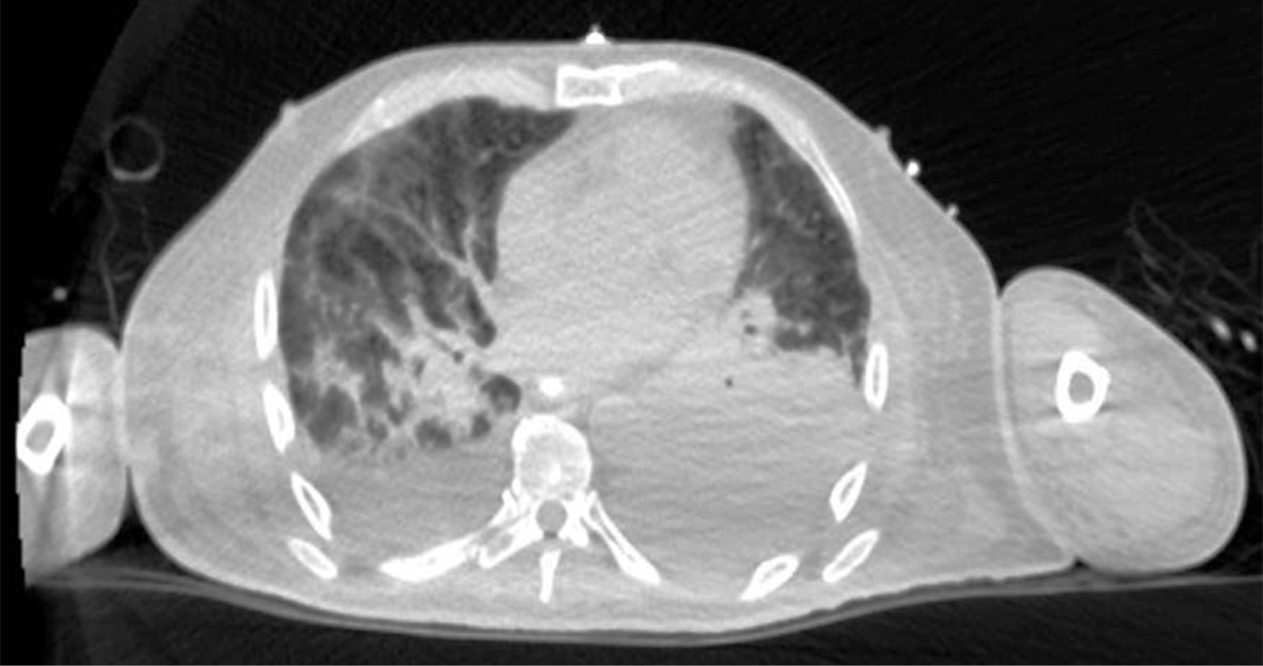 On admission, the patient did not report any abdominal symptoms, so gastrointestinal involvement was not suspected. Subsequently, intravenous sedation and orotracheal intubation were performed, making it impossible for the patient to manifest gastric involvement. The only sign the patient presented was hematemesis 24 hours after the nasogastric tube placement, which ruled out the possibility of healthcare-associated mucormycosis since 24 hours are not enough to achieve the introduction, inoculation, and growing of the fungus. This led to the hypothesis that the patient acquired the fungal infection in his community. The diagnosis may be suspected by endoscopic findings, such as a fungal mass or necrotic lesions covering ulcerated areas that may perforate tissues and cause peritonitis.2 Often, the study protocol is initiated in the presence of an intra-abdominal abscess; the diagnosis can be made by biopsy of the suspicious area during surgery or endoscopy.7 Few samples are usually sent for culture,2 and those sent are positive in only 30%, in addition, specialized culture media such as potato dextrose agar are required for fungal growing.12 Confirmatory molecular tests that may detect surface antigens are also required, but they are not yet available.2 CT findings may include focal or diffuse thickening of the gastric wall, pneumatosis with decreased wall enhancement on contrast administration (emphysematous gastritis) secondary to ischemia and necrosis, adjacent collections, wall necrosis with focal disruption or perforation, and rarely, pneumoperitoneum.13 When hematemesis occurs, the next diagnostic step should be an upper endoscopy. However, the abdominal distention presented by the patient suggested a high probability of perforation of the hollow viscera, so initially, a CT scan of the abdomen was performed. A surgical emergency was considered when reporting gastric pneumatosis and pneumoperitoneum, ruling out an endoscopy. Exploratory laparotomy allows direct exploration of the stomach and partial resection of the stomach as a diagnostic and therapeutic measure. Treatment consists of antifungal and urgent surgical debridement since necrotic tissue's presence will affect the antifungal's penetration to the tissues; additionally, aggressive medical support for comorbidities should be provided.14 Intravenous liposomal amphotericin B is the treatment of choice. It is more effective than conventional amphotericin B.15 Delaying the initiation of amphotericin for more than six days, doubles mortality.4 Although most of literature favors aggressive surgical treatment, we opted for a more conservative treatment by preserving a portion of the stomach and performing only a vertical gastrectomy since macroscopic inspection showed a clear demarcation between necrotic and viable tissues. We consider that the surgical treatment we performed was correct since, in the post-surgical follow-up, the patient had a good evolution; the methylene-blue test and the two abdominal CT scans with contrast in the stomach through the nasogastric tube allowed us to verify the integrity of the suture line from the first post-surgical day until the day of his death. The sample sent to pathology allowed to make the diagnosis and thus initiate targeted therapy with amphotericin B, and since no fungal infection by Mucor sp. at any other organic level was found, the cause of death was attributed to nosocomial infectious complications at the pulmonary and urinary level.