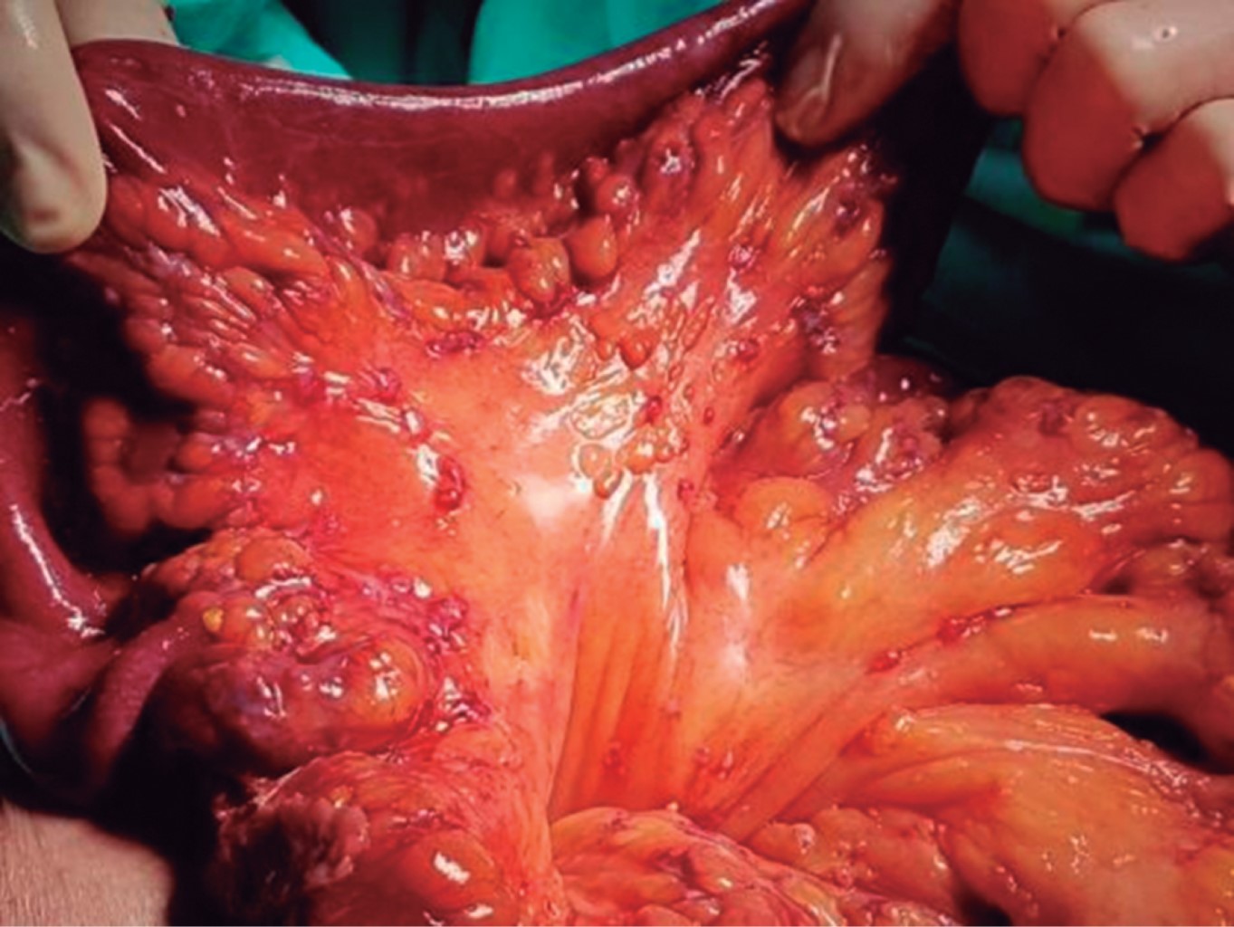 After 48 hours he was reoperated (second look). The Bogota bag ass withdrawn. A few thrombosed vessels on the non-ischemic omentum were found. The small bowel loops were dilated, edematous, and without peristalsis. The mesentery was thickened, cramped, with multiple swollen lymph nodes. The distal segment (stoma) had no signs of ischemia. The terminal ileum stump showed no leak (Figure 3). The abdominal wall was closed with a continuous suture with polydioxanone 1 in two stages, and Blanco Benavides stitches were used with braided polyester 5.