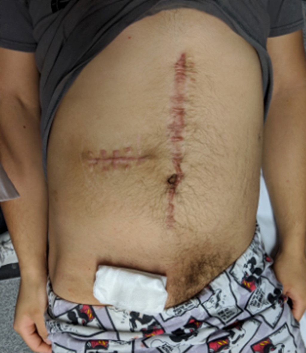 Subsequently, he continued his evolution on the general surgery floor, where the suggested laboratory results were obtained (Ac anticardiolipin IgG 59, IgM 50.2), and a diagnosis of primary antiphospholipid syndrome was made. The patient was discharged with a functional ileostomy. Follow-up by general outpatient surgery and rheumatology continued, and intestinal reconnection was performed electively at six months (Figure 4) without complications.