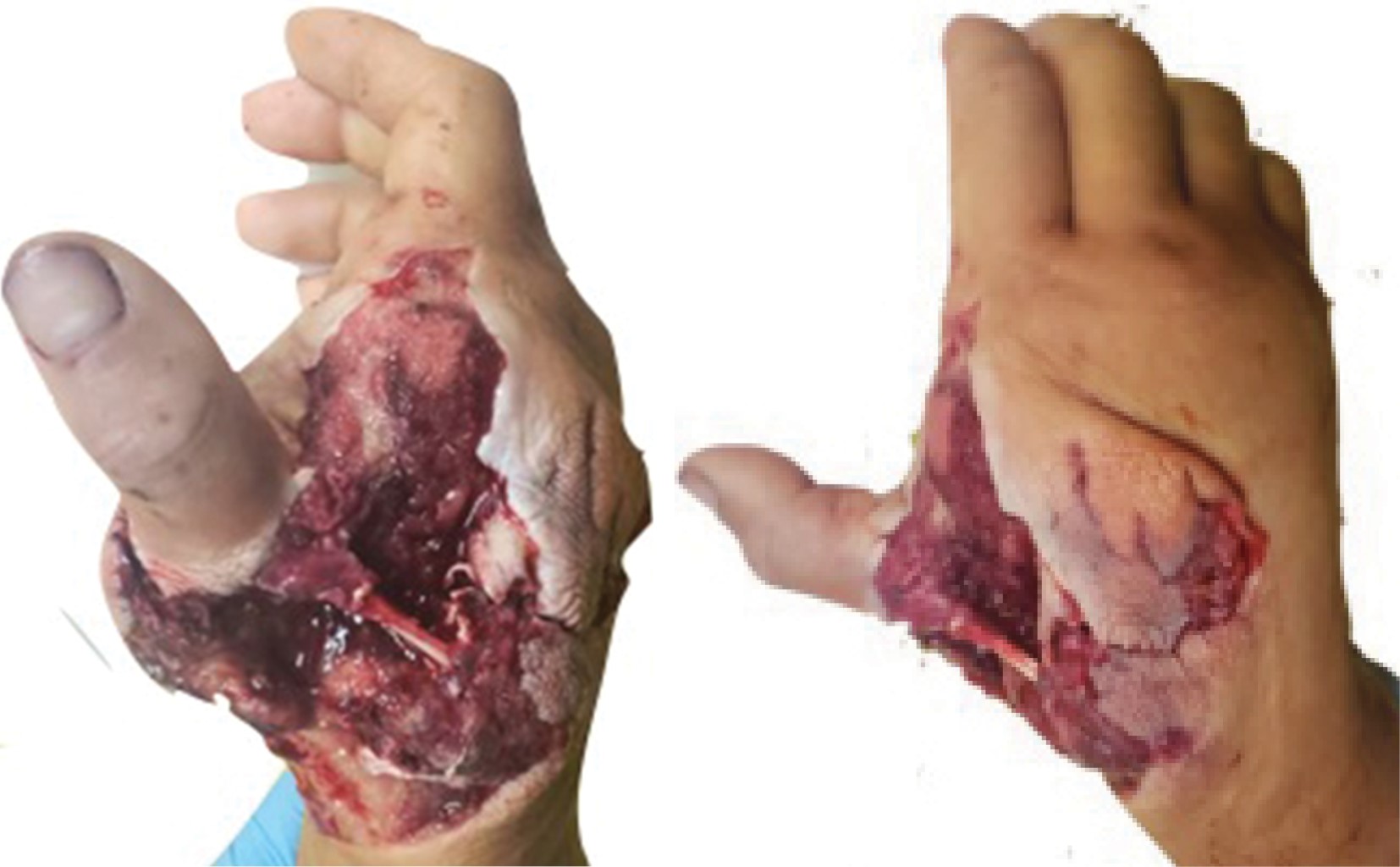 Gunshot wounds cause about 15% of open fractures admitted in a hospital in border cities, up to half of these are serious injuries with a high incidence of skin and bone loss, and in severe cases with vascular damage. We report the case of a patient with traumatic hand injury secondary to a gunshot wound with a radial artery injury treated with a free radial contralateral forearm flap without success, subsequently an anterolateral thigh flap was performed with good outcomes for his social and labor reintegration.