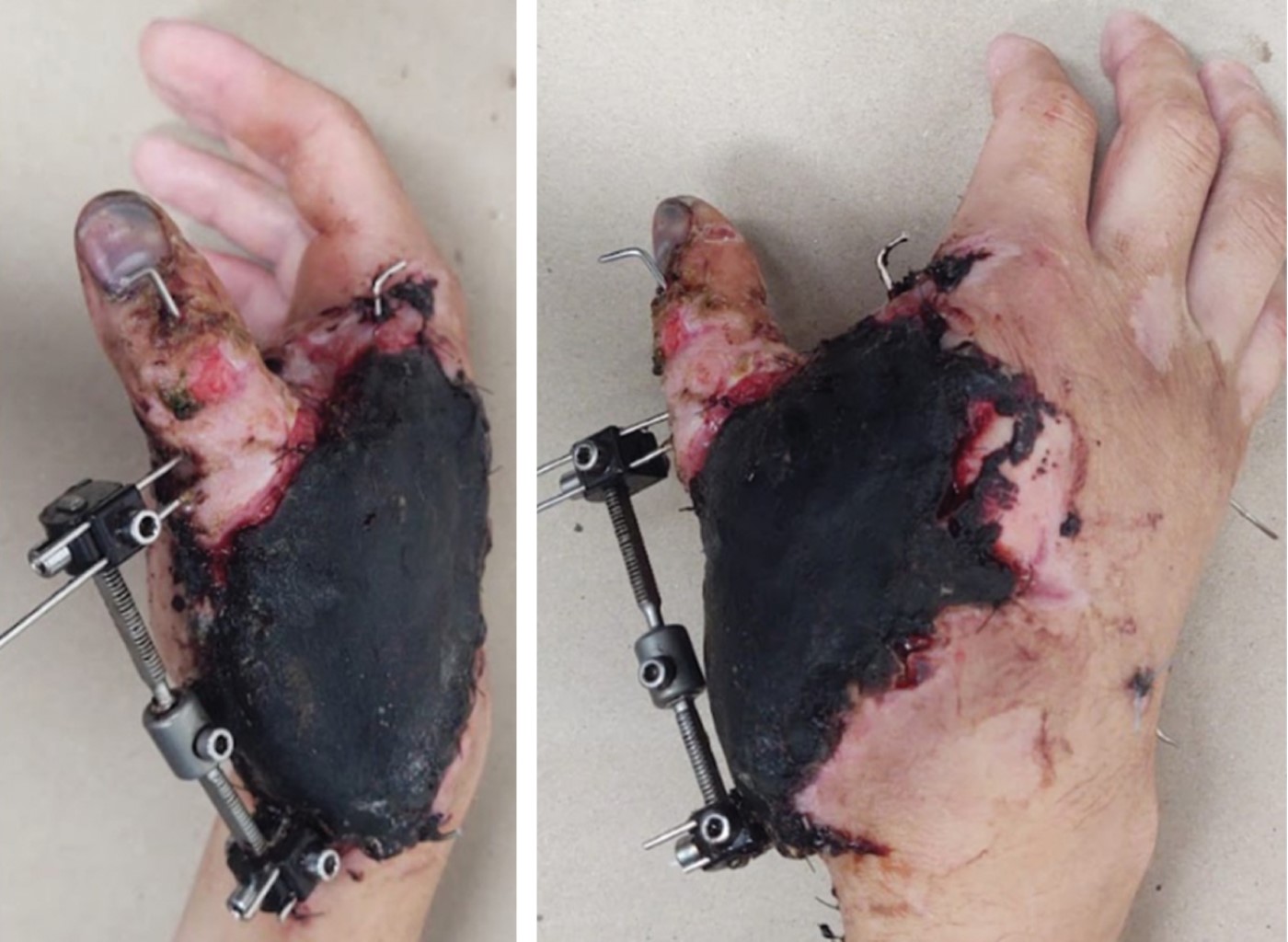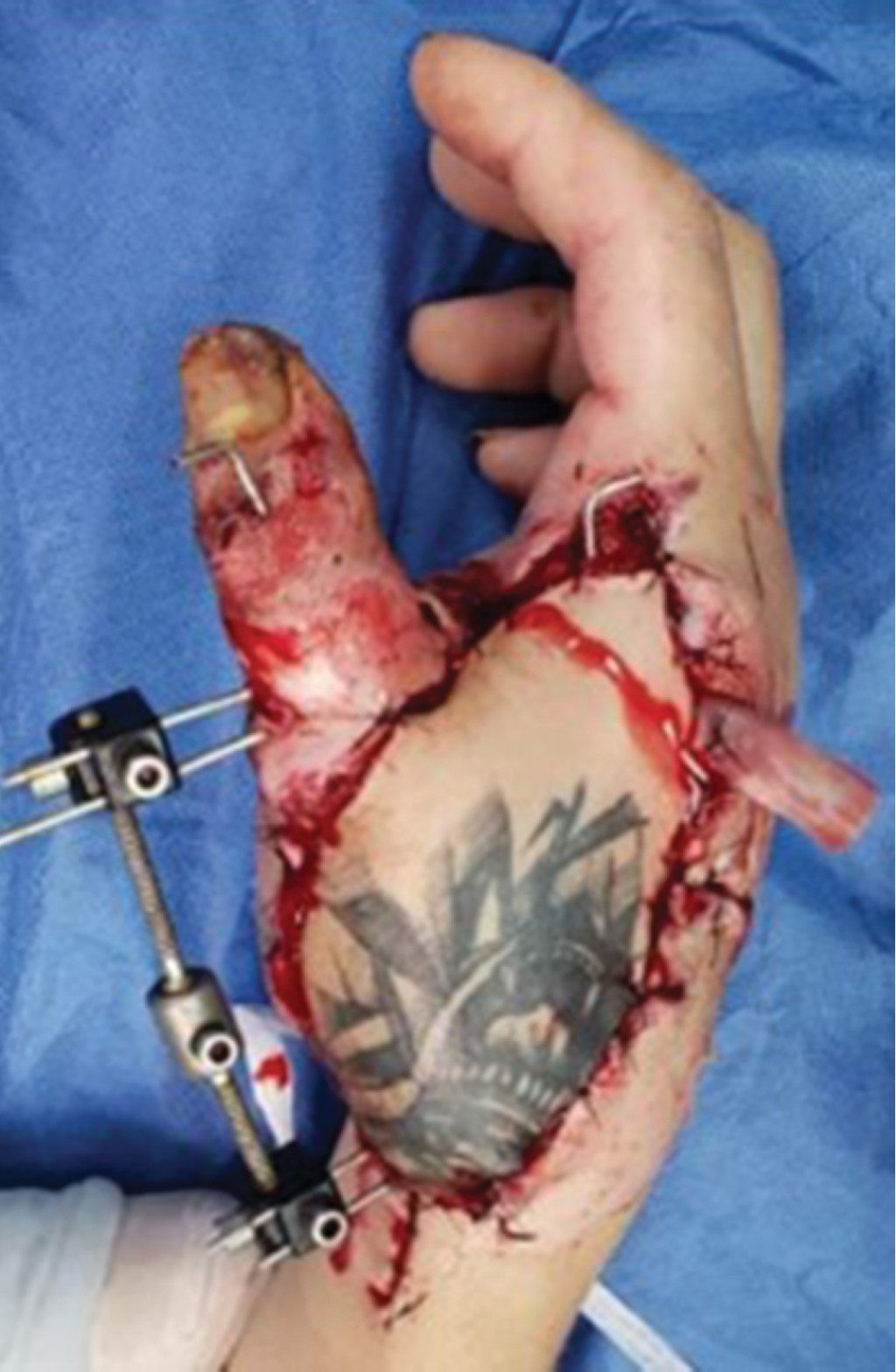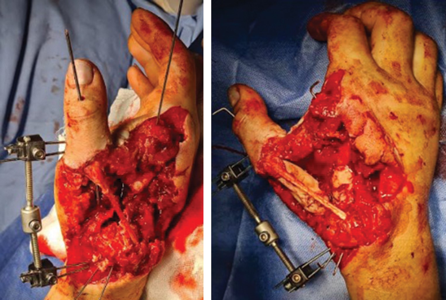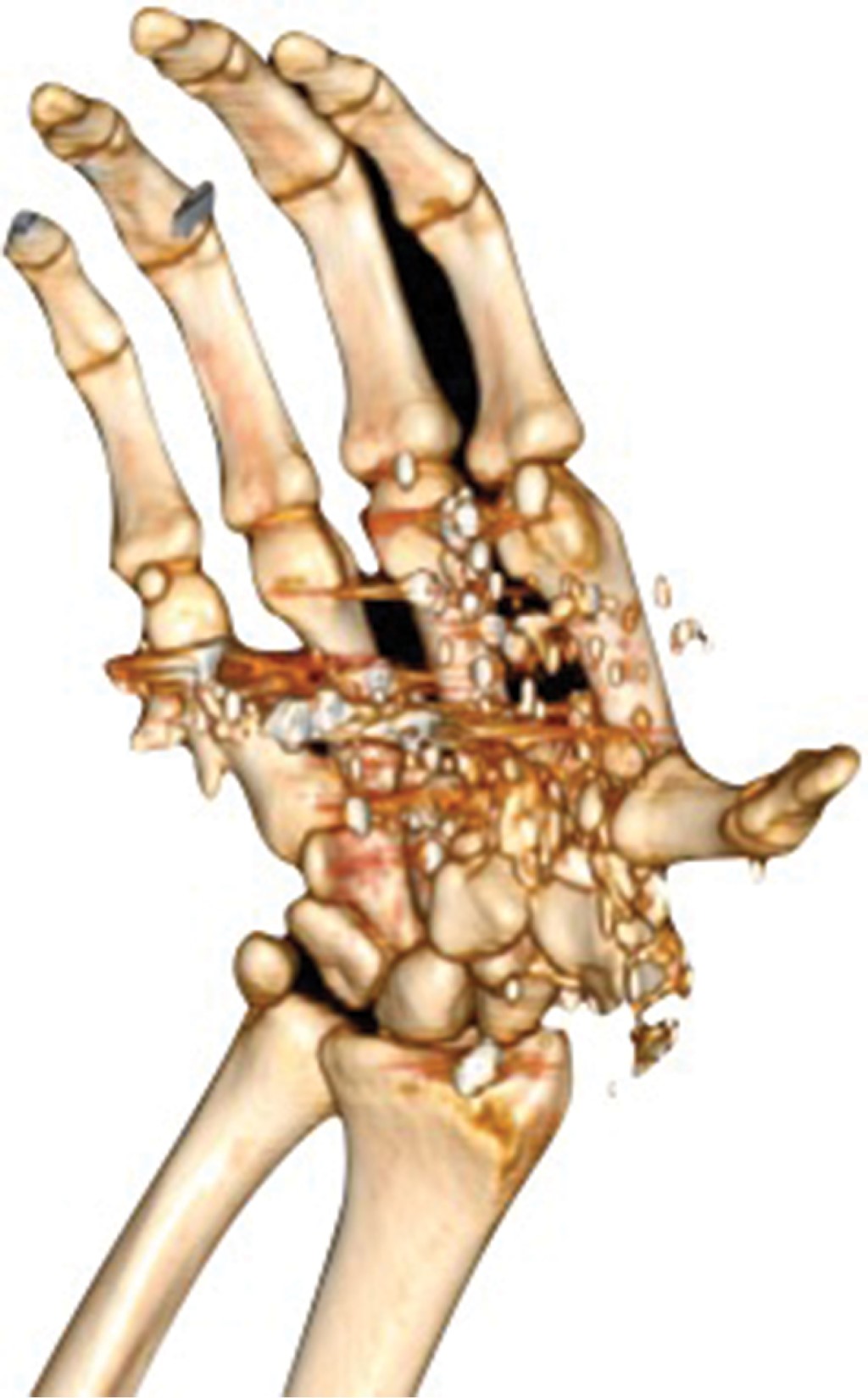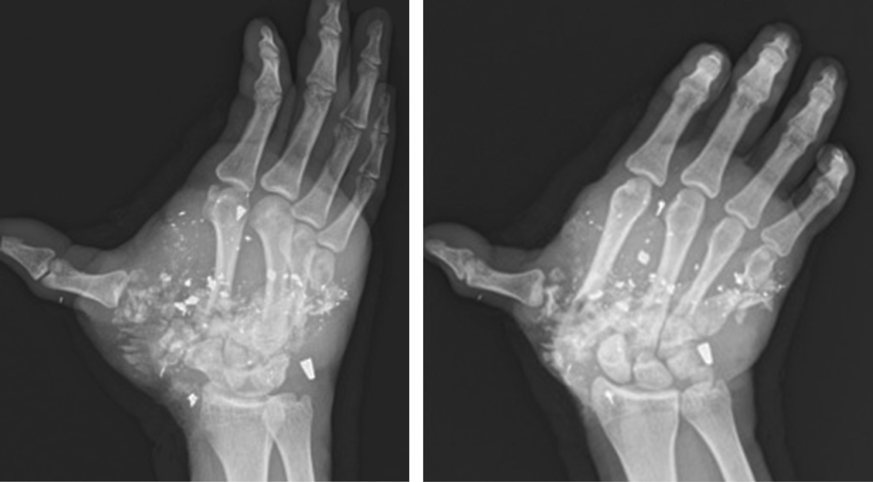 De la Rosa-Massieu D, González-Sánchez M, Onishi-Sadud W, Gómez-Chavarría J, Bello-González A. Lesión severa de mano por proyectil de arma de fuego de alta energía con artrodesis del carpo e injerto sintético de hueso más fijadores externos: reporte de un caso. Acta Ortop Mex. 2014; 28 (4): 240-243.