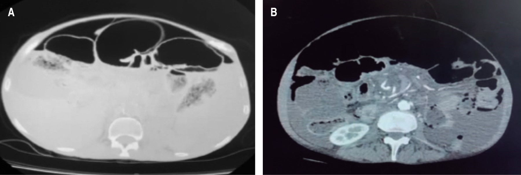 Intestinal pneumatosis represents a rare clinical entity characterized by the gas accumulation in the submucosa or subserosa, forming cystic lesions within the gastrointestinal tract.1 This pathology was first reported in 1730 by Du Vernoi and subsequently subcategorized by Koss in 1952.2,3 The incidence of intestinal pneumatosis is still not precisely known. However, it is increasingly reported as a finding due to the frequent use of computed tomography in abdominal pathologies.4 It can occur in any age group, from neonates to geriatrics,3 with a slight male predominance and peak presentation between 30 and 50.5,6 One autopsy series reported an incidence of 0.03% in the general population.3 Intestinal pneumatosis can affect any segment of the digestive tract from the esophagus to the rectum, but most frequently occurs in the small intestine (42%) (60% in jejunum, 30% in duodenum, and 10% in ileum), followed by the colon (36%) or both (22%), according to reports in the literature.3-5 These cysts contain a mixture in variable amounts of nitrogen, hydrogen, oxygen, carbon dioxide, butane, propane, methane, ethane, and argon.5 In approximately 85% of patients, the pneumatosis is associated with chronic pulmonary pathology, rheumatologic diseases, immunosuppression, or gastrointestinal diseases, being classified as secondary intestinal pneumatosis; the remaining 15% have no underlying pathology, its etiology being idiopathic, so it is classified as primary pneumatosis.7 Most cases are asymptomatic, although up to 30% may manifest as acute abdomen secondary to spontaneous pneumoperitoneum due to rupture of the bullae.5