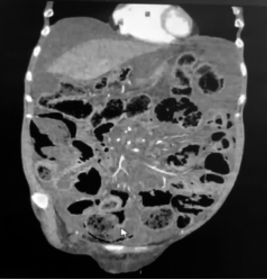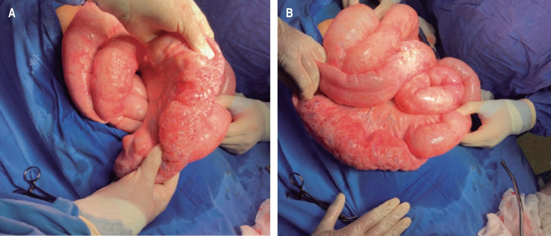 We present the case of a 61-year-old female patient who came to the emergency department with distension, intense and diffuse abdominal pain, intolerance to oral intake, and nausea leading to vomiting with food characteristics of a week's evolution with sudden exacerbation in the last day. As important personal history, she was diagnosed with systemic sclerosis in treatment with immunomodulators, primary hypothyroidism, and chronic liver disease under study, which required therapeutic paracentesis a year ago. The physical examination revealed an afebrile and conscious patient with a globose abdomen tympanic to percussion, decreased peristalsis, pain on deep palpation in the four quadrants, without evidence of peritoneal irritation; no masses or tumors were palpated, there was no ascites fluid under tension, and rectal examination showed no alterations. Laboratory studies were requested on admission without significant alterations, and an ultrasound did not show conclusive changes, with little perihepatic ascites fluid. Conservative management was started with fasting, antibiotic therapy with a double scheme (ciprofloxacin plus metronidazole), and placement of nasogastric tube without exit of food or fecal material through it, without data of improvement, with diaphoresis and progression of abdominal pain, so it was decided to perform a contrasted computerized tomography scan of the abdomen, where air and free liquid in the cavity with high suspicion of intestinal perforation was visualized (Figures 1 and 2). The surgical findings were free air in the abdominal cavity with cystic intestinal pneumatosis of benign origin in the entire small intestine, scarce ascites fluid, and no associated intestinal perforation data (Figure 3). Given this situation, the diagnosis of intestinal pneumatosis was proposed. The evolution was favorable after the three-day intervention with analgesic treatment, antibiotic therapy, and intestinal rest. After six days of remission of the clinical picture, without complications, the patient was discharged and sent to the general surgery outpatient clinic for continued monitoring.