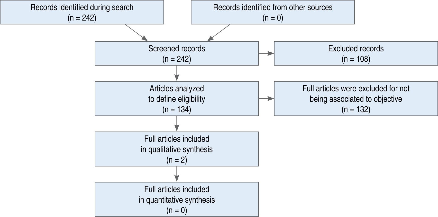With the search terms, 242 publications were found. Of these, 108 were excluded from the screening by title and abstract, and 28 because they were review articles. Although there was no initial restriction by language, two articles in German, five case presentations, one letter to the editor, and one commentary were excluded. The rest were excluded because they did not correspond to the research objective. Two articles were selected from the review for qualitative analysis.