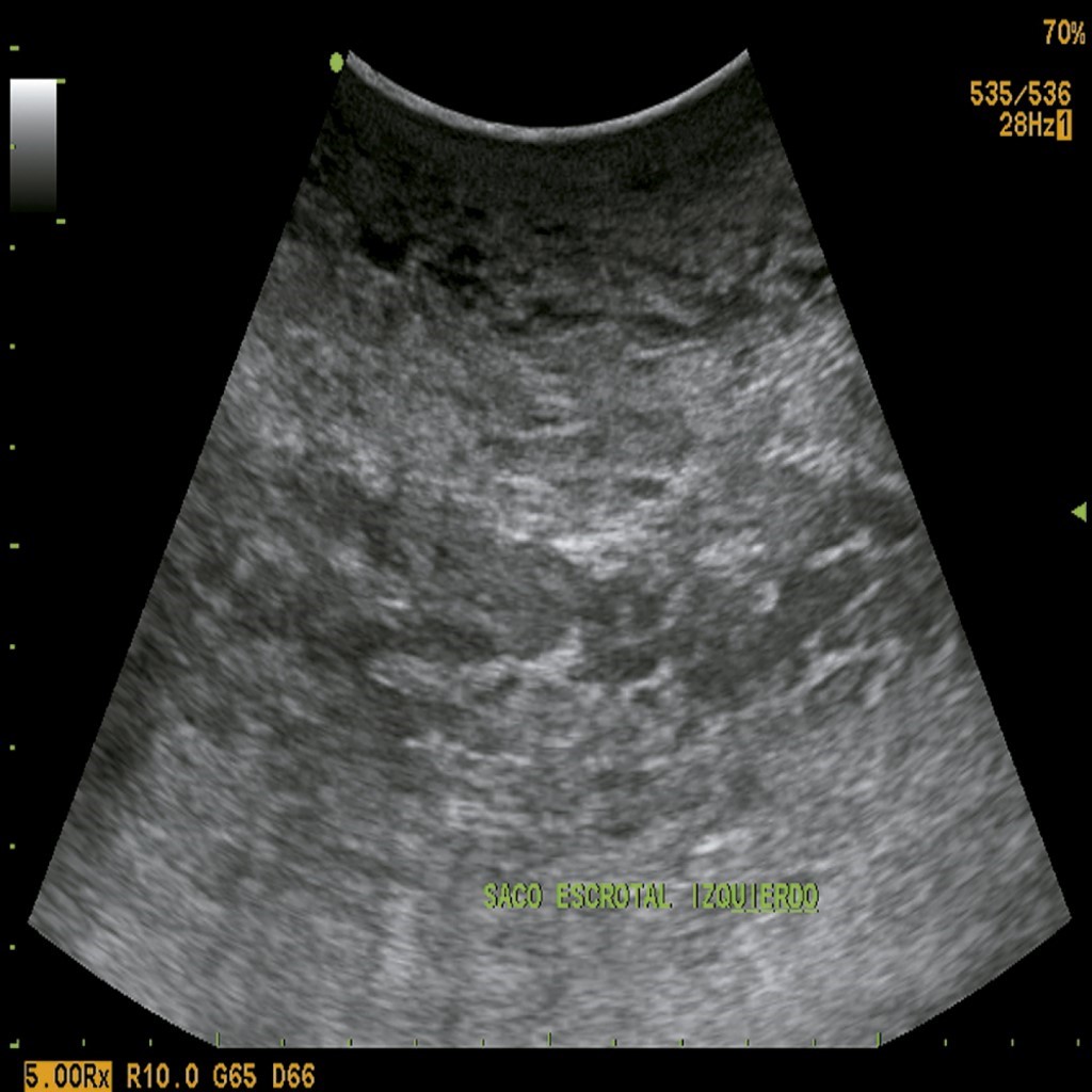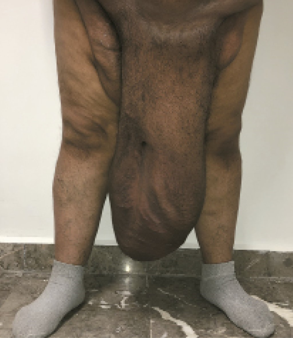 A 32-year-old male Mexican patient of mestizo ethnicity, a cab driver with a personal history of a sedentary lifestyle, and morbid obesity (body mass index [BMI] = 57), came for consultation for presenting a left inguinoscrotal hernia of 10 years of evolution. Physical examination confirmed that the patient had an inguinoscrotal hernia exceeding the upper border of the left patella and trophic changes of the scrotal skin (Figure 1). Inguinal ultrasound showed a hernial sac with intestinal and omental contents. He was started on NPP during his hospital stay by inserting a Veress needle at Palmer's point. 200 cm3 of room air was insufflated with a 100 cm syringe.3 Subsequently, a double-lumen catheter (subclavian) was placed with the Seldinger technique. An 800 cm3 of room air was insufflated, and a standing chest X-ray corroborated pneumoperitoneum. 1,000 cm3 were administered every 24 hours for 21 days up to a total volume of 21,000 cm3.