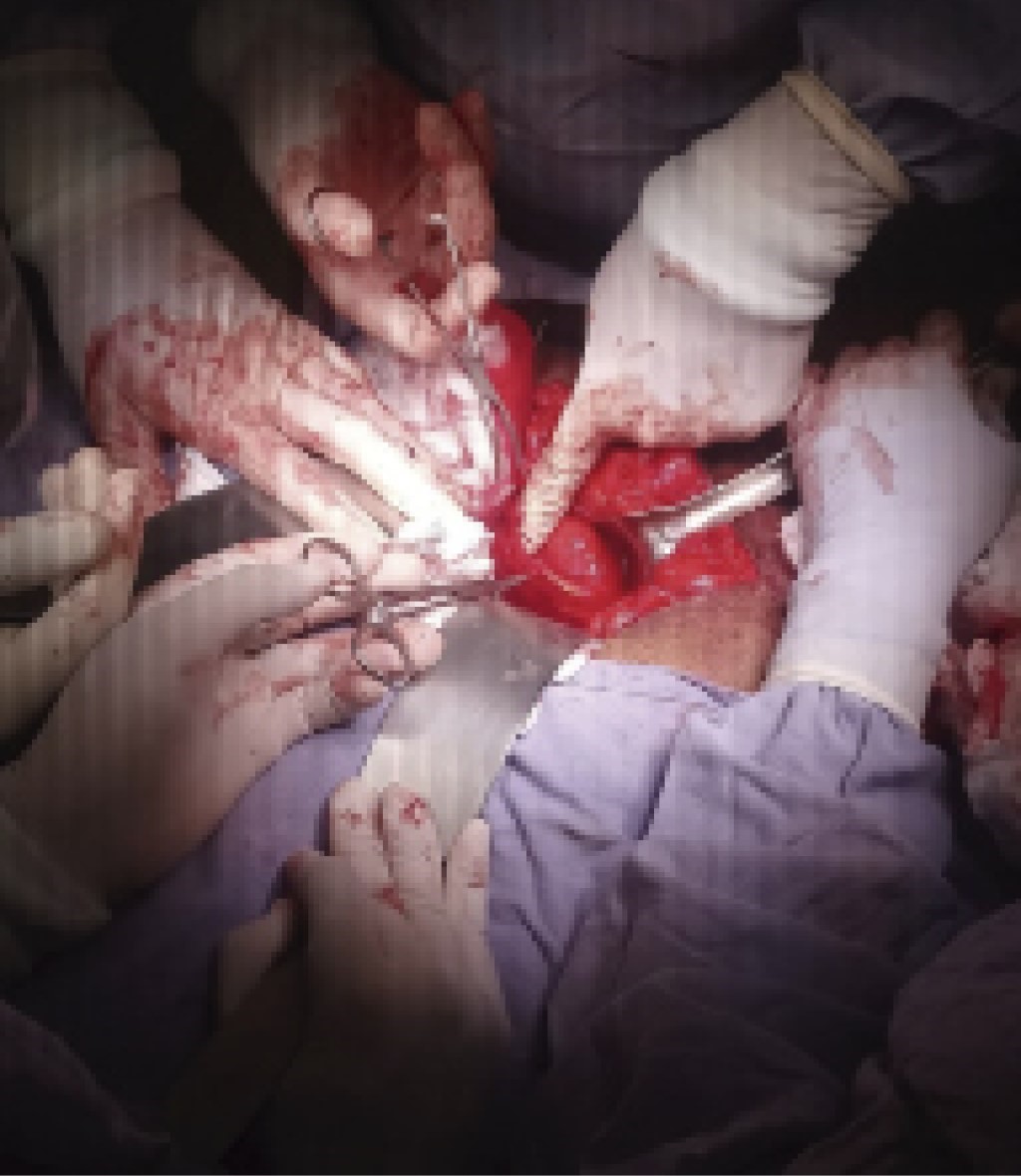 Under regional anesthesia, a left inguinal approach was performed through a standard transverse incision. A direct hernial sac was identified, dissected, and separated from the spermatic cord. After opening the hernia sac, small bowel loops, sigmoid colon, and omentum were identified (Figures 2, 3 and 4), which were manually introduced into the abdominal cavity without difficulty. The anatomical defect was repaired according to the Lichtenstein technique; there were no restrictive pulmonary changes during the transoperative and postoperative periods. The patient was discharged on the fourth day of hospital stay due to improvement. There was no hernia recurrence after clinical and ultrasound follow-ups for 1.5 years (Figure 5). The patient reports that his quality of life has improved notably, increasing his personal and sexual relationships.