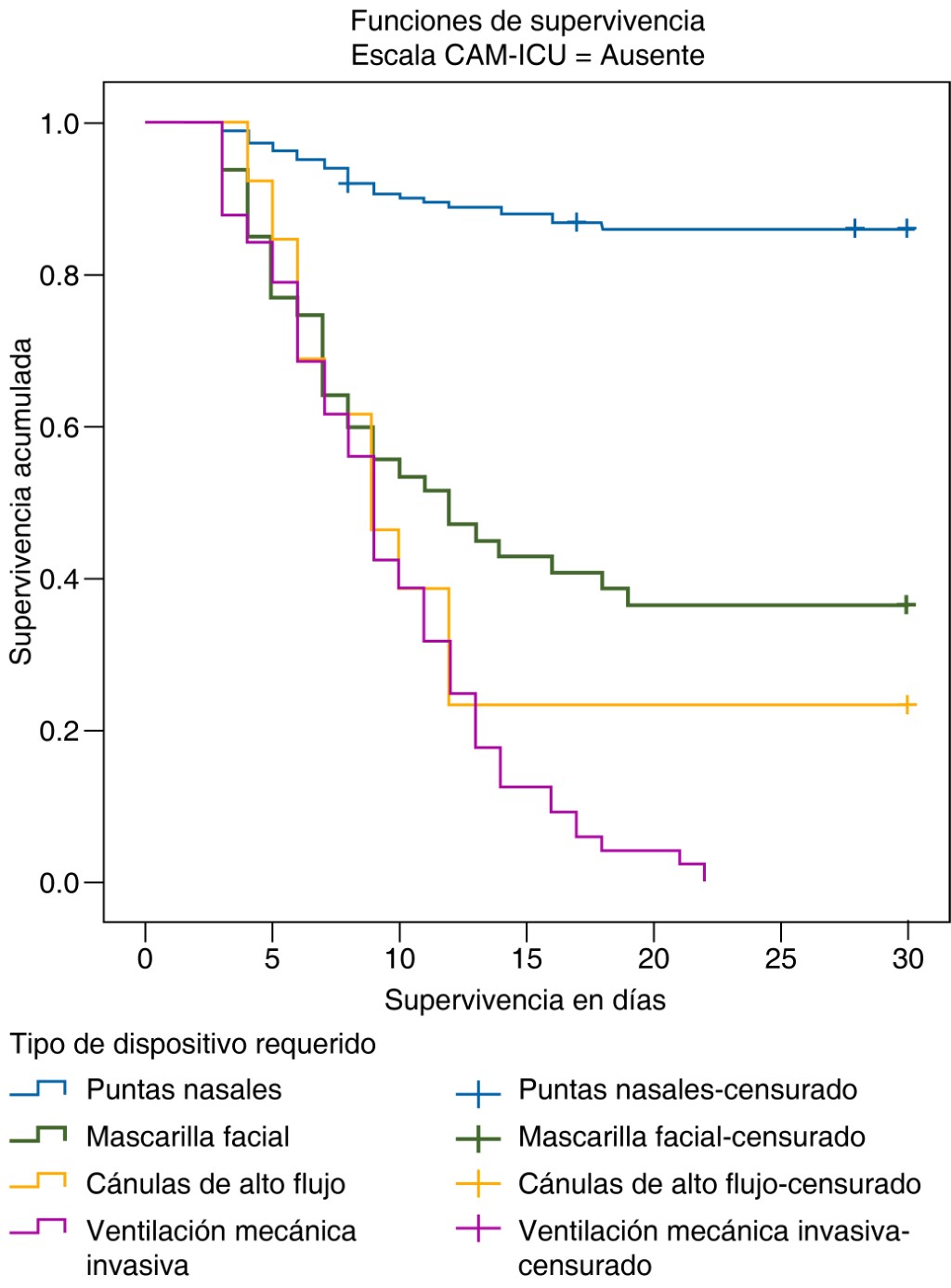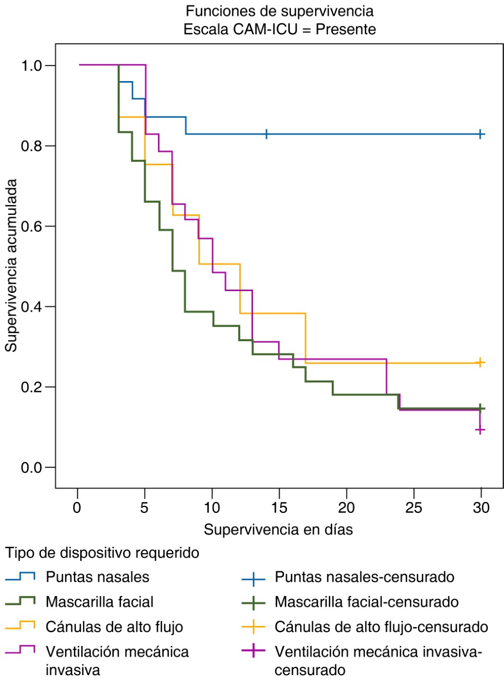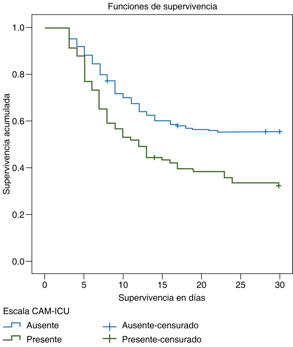 Material and methods: observational, retrospective, longitudinal and comparative study in patients older than 65 years with severe SARS-CoV-2 pneumonia. The cumulative individual survival probability was calculated using the Kaplan-Meier metho d based on the presence or absence of delirium during hospitalization, and the log-rank test identified whether there was a significant difference in survival between groups.