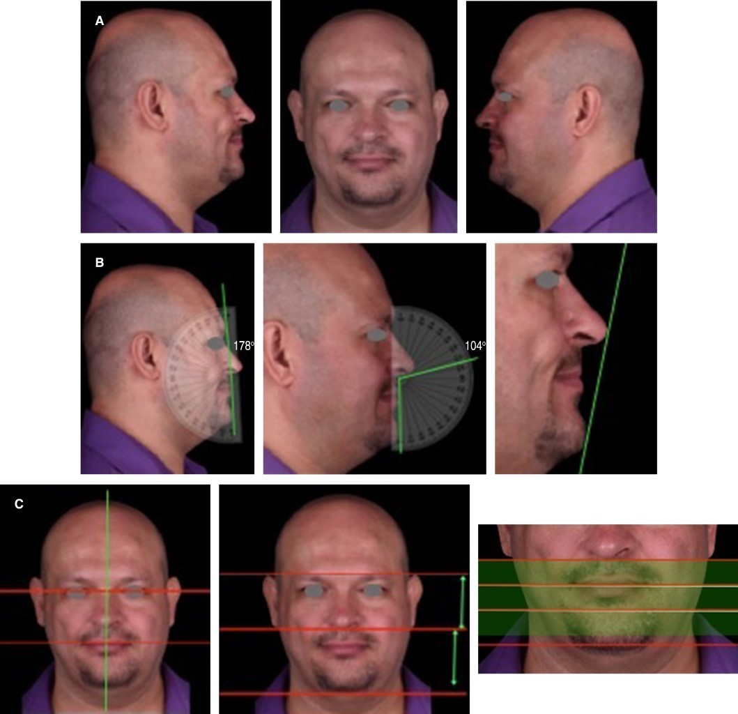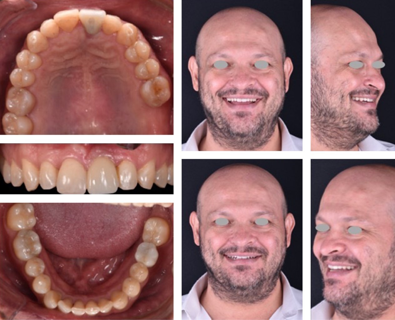 Male patient, 42 years old, with the reason for consultation "I have lost a tooth". He presents a medical history of arterial hypertension with an evolution of 6 years, under treatment with enalapril 10mg every 12 hours. The extraoral examination showed a mesocephalic facial biotype, a straight facial profile of 178o, a naso-labial angle of 104o and no remarkable facial asymmetries (Figure 1A-C) according to Fradeani.11