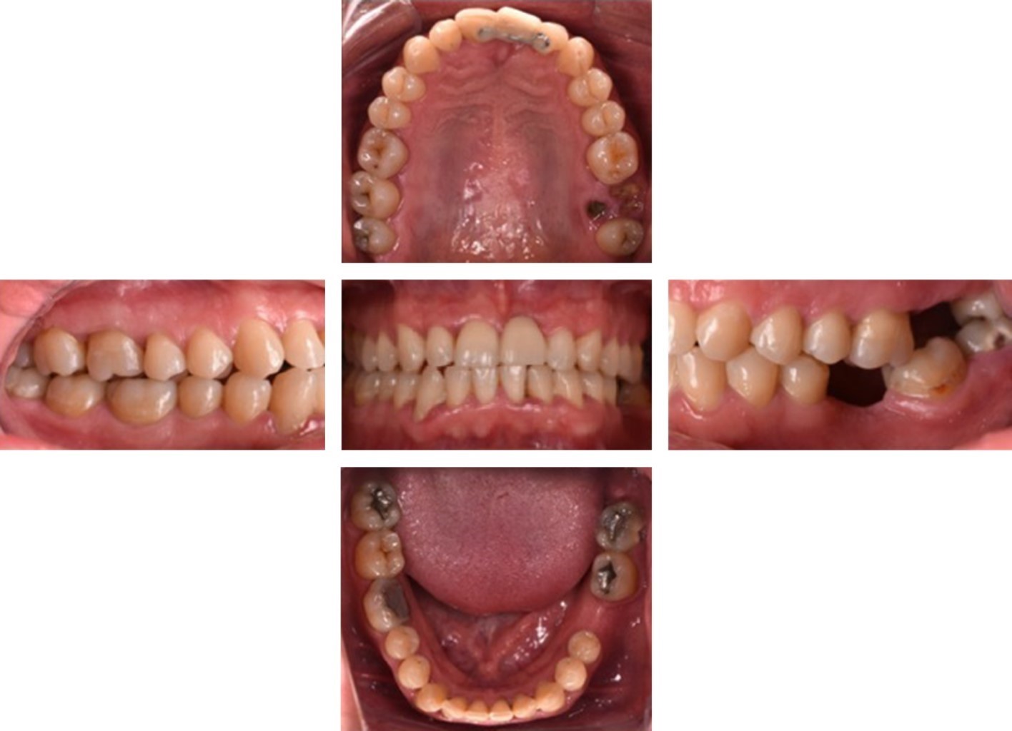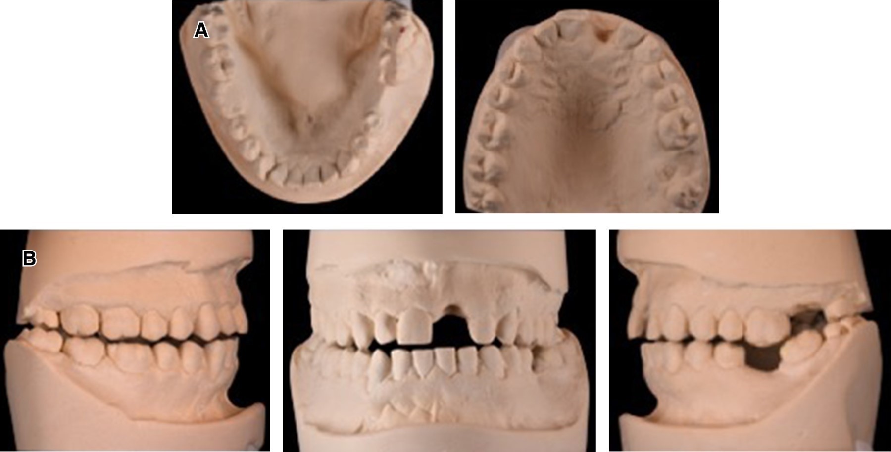 The orthopantomography analysis confirmed the absence of teeth 21 and 36 as well as the presence of root fragments of molar 27 and a defective restoration in 38 (Figure 3). The study models analysis, mounted in a semi-adjustable articulator, revealed a discrepancy between centric relation and maximum intercuspation records (Figure 4A-B).