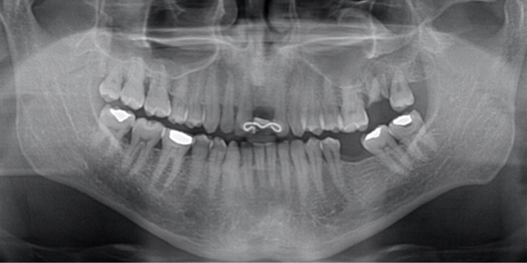 After 5 months, the implant was loaded with a screw-retained acrylic resin temporary, by which the critical and subcritical profiles were formed for 3 months. After the soft tissue management, an impression with polyvinylsiloxane was taken copying the emergence profile of the temporary to fabricate a final cement- and screw-retained restoration on a Variobase Standard abutment (Straumann) with the same emergence profile. The final restoration was made with a zirconia base and vestibular coverage of feldspathic porcelain. Additionally, molar 18 was extracted; teeth 17, 16, 13, 11, 23, 33, 43, and 47 were restored with composite resins; in molar 47 an indirect restoration of lithium disilicate was placed and the edentulous area of molar 36 was rehabilitated with an implant and a screw-retained metal-ceramic crown (Figure 8).