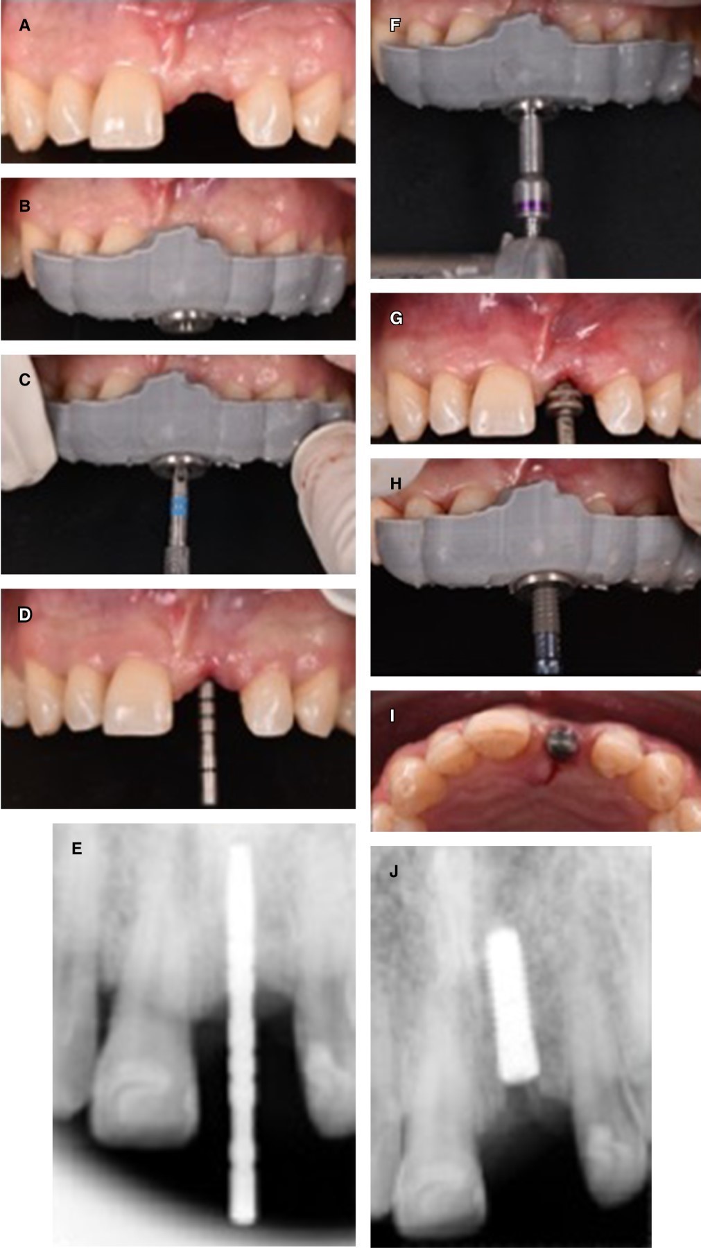 Periodontal and prosthetic phase I was performed, eliminating risk factors (caries, defective restorations, plaque, and calculus) and giving oral hygiene instructions. A cone beam computed tomography (CBCT) was indicated (Figure 5A) with the implementation of a tomographic guide elaborated from a diagnostic wax-up (Figure 5B) to observe the dimensions of the residual ridge (Figure 5C) and to choose an implant with ideal dimensions. Risk areas that may present a possible fenestration of the implant were identified to treat them adequately. Figure 6A shows the initial situation to be rehabilitated. Subsequently, we proceeded to the implant placement of tooth 21 (Straumann, SLActive, ø 3. 3, length 12 mm) using a restrictive guide (Figure 6B) for correct three-dimensional positioning in relation to the prosthetic dimension and the presence of bone tissue. The drilling sequence of the receptor site was started (Figure 6C-F) and the implant was inserted achieving primary stability of 35 Ncm2 (Figure 6G-I). Finally, the mesiodistal position of the implant was verified by taking a dentoalveolar radiograph (Figure 6J).
