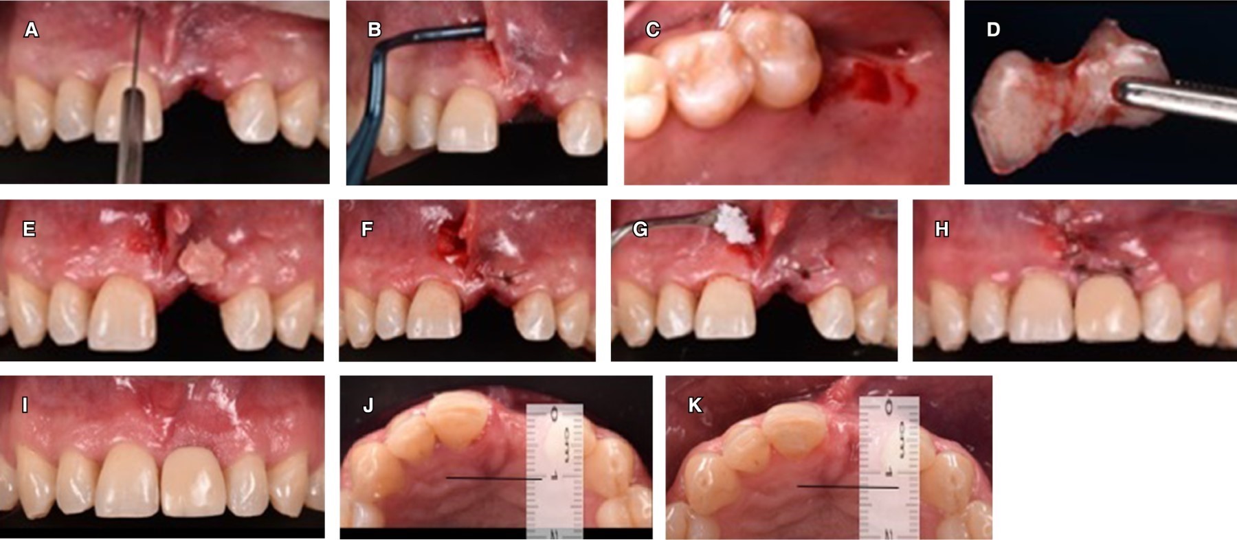 After implant placement, connective tissue and bone grafts were used to prepare the receptor site with the VISTA tunneling technique because it is a minimally invasive technique. It avoids flap elevation and preserves the blood supply to prevent bone tissue collapse and loss of the interdental papilla thus providing greater postoperative comfort for the patient. A vertical incision was made adjacent to the labial frenulum (Figure 7A-C); guided bone regeneration was performed through a tunnel, using connective tissue graft (Figure 7D-E). The donor site was the retromolar area of the maxilla, distal to molar 17; xenograft (NuOss) was placed (Figure 6F-G) in addition to resorbable collagen membrane (RCM6) and it was sutured with 5-0 catgut thread (Figure 7H). A provisional prosthesis was attached with orthodontic wire to the adjacent teeth (Figure 7I). Figure 7J depicts the pre-surgical situation; after 3 months of healing, an increase in height of the gingival margin that outlines tooth 21 was obtained, around 0.5 mm (Figure 7K).