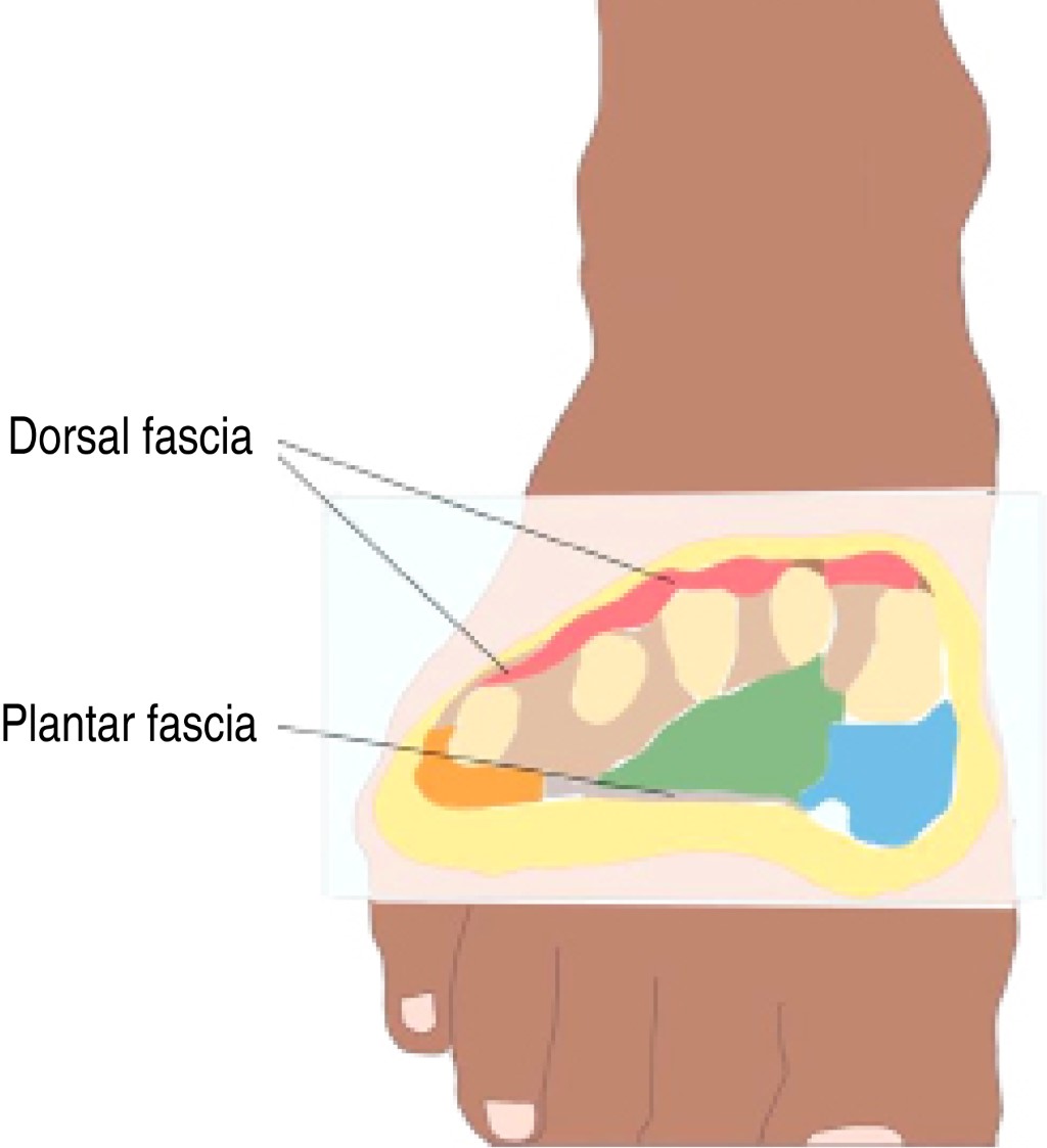 The foot (Figure 2) has medial plantar, central plantar, lateral plantar, interosseous, and dorsal compartments.