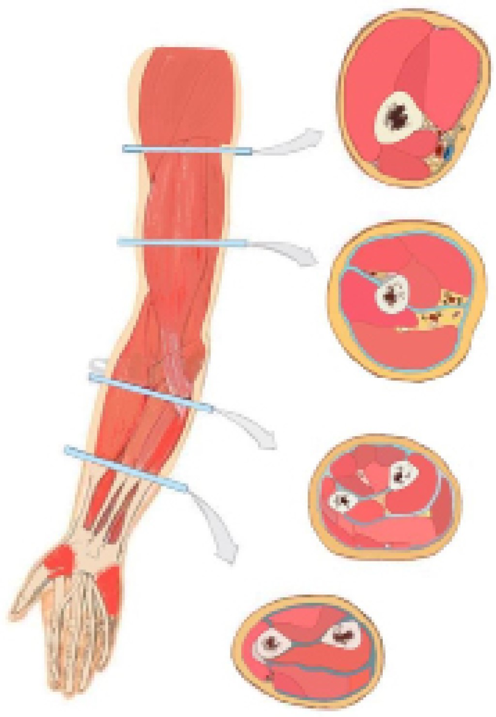 At the level of the upper extremity (Figures 3, 4 and 5), specifically in the arm, there are anterior and posterior compartments.