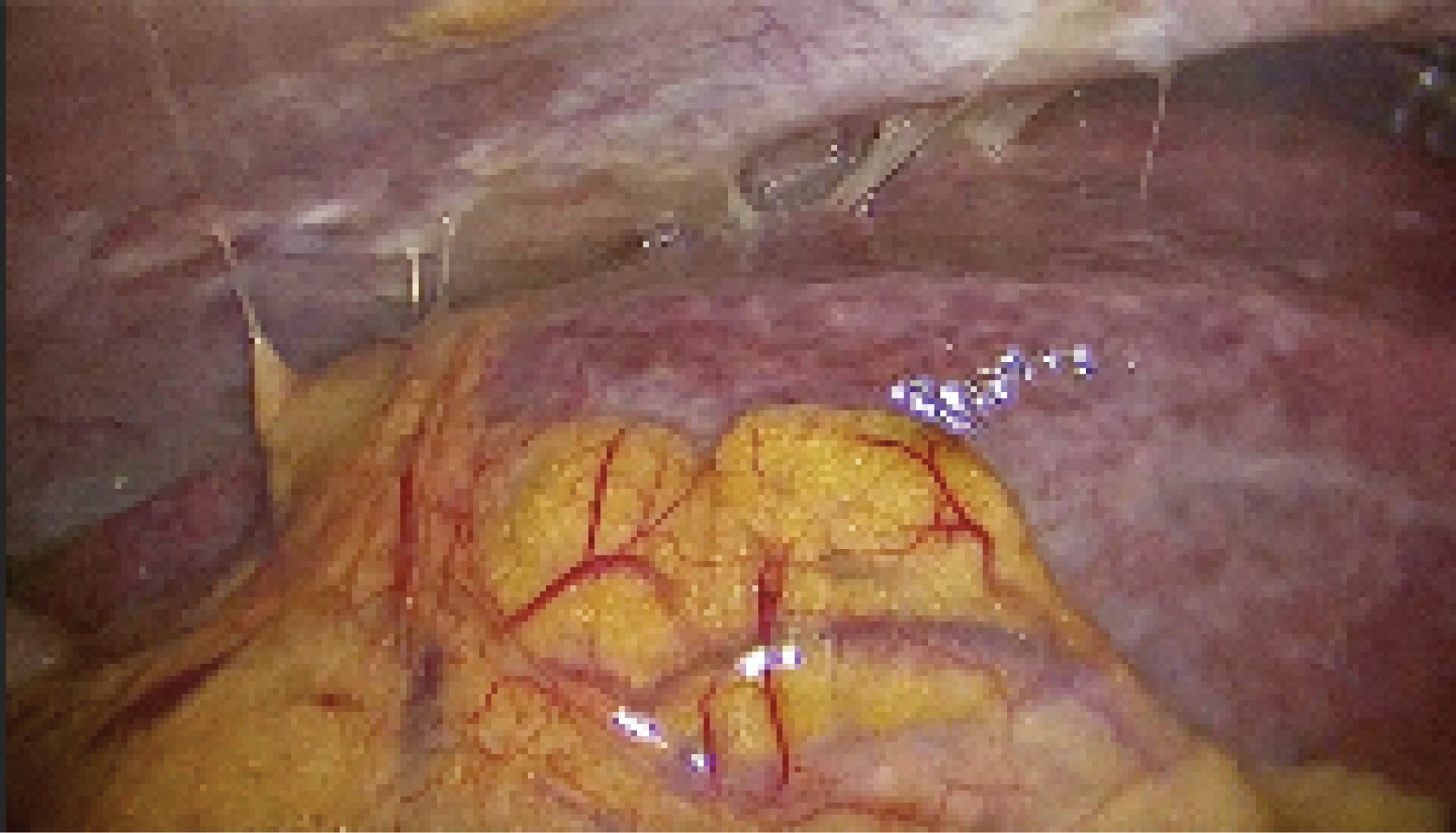 Antibiotic therapy based on carbapenems and imidazole was started with subsequent surgical management. Cholecystectomy plus abscess drainage and placement of drains by laparoscopy were performed. Four trocars of 12 mm were placed in the umbilical and subxiphoid region; in the hypochondrium and right flank, a 5 mm trocar was placed. We found a gallbladder covered entirely by omentum corresponding to Parkland 5 (Figure 4) with edematous walls and a hepatic abscess in segments IV and V adhered to the abdominal wall. Approximately 200 cm3 of purulent material (pyococcus and abscess) were drained (Figure 5), which were sent to culture, where growing of Streptococcus anginosus and Enterobacter cloacae was reported. The surgical piece was removed with an extractor bag, and finally, 19 Fr Blake-type closed drains were placed into the Winslow's hiatus and the abscess cavity, the patient was discharged home on the fourth postoperative day. The antimicrobial scheme was adjusted at discharge with ampicillin/sulbactam and metronidazole to complete 14 days of antibiotic therapy. In the follow-up consultation, on the seventh postoperative day, the patient was pain-free at the surgical site, afebrile, with good tolerance to oral administration and regular bowel movements. It was decided to remove both drains.