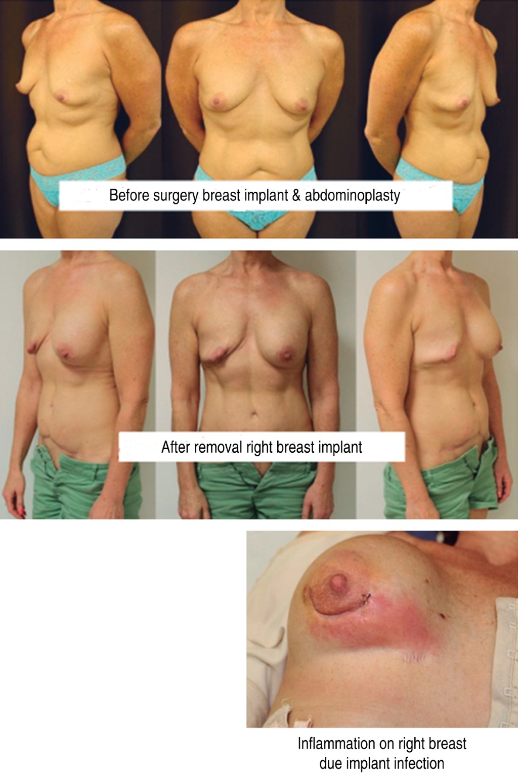 - • Case 1. A 50-year-old female patient from Vancouver, Canada, underwent abdominal contour surgery (abdominoplasty) and breast augmentation mammoplasty. The week after surgery began with an increase in temperature in the right breast and discharge of purulent material. In culture, Pseudomonas aeruginosa was isolated. The patient presented fever and malaise, which is why she was admitted for treatment with intravenous antibiotics. The patient was taken to the operating room where the prosthesis was removed and the pocket was washed. She was discharged with continuing treatment using oral antibiotics. The patient returned to her country of origin. Six months later, the implant was relocated without presenting complications (Figure 1).