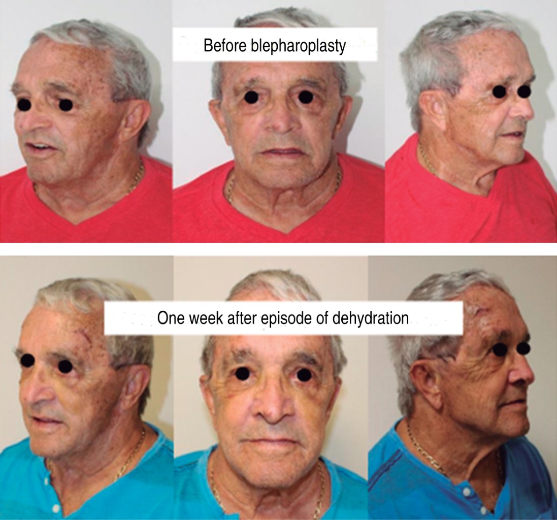 - • Case 2. An 81-year-old male patient from Quebec, Canada, suffered from high blood pressure with good control and underwent blepharoplasty, which was performed without complications. Three days later, the patient went to the emergency room for heat stroke. He received intravenous hydration. The patient did not speak English or Spanish. The indications were not clear, and he understood that he should not bathe and should not stay in places with air conditioning. At the time of discharge from the emergency room, the information was explained with the help of a translator. The evolution of the patient´s conditions was followed without any complications (Figure 2).