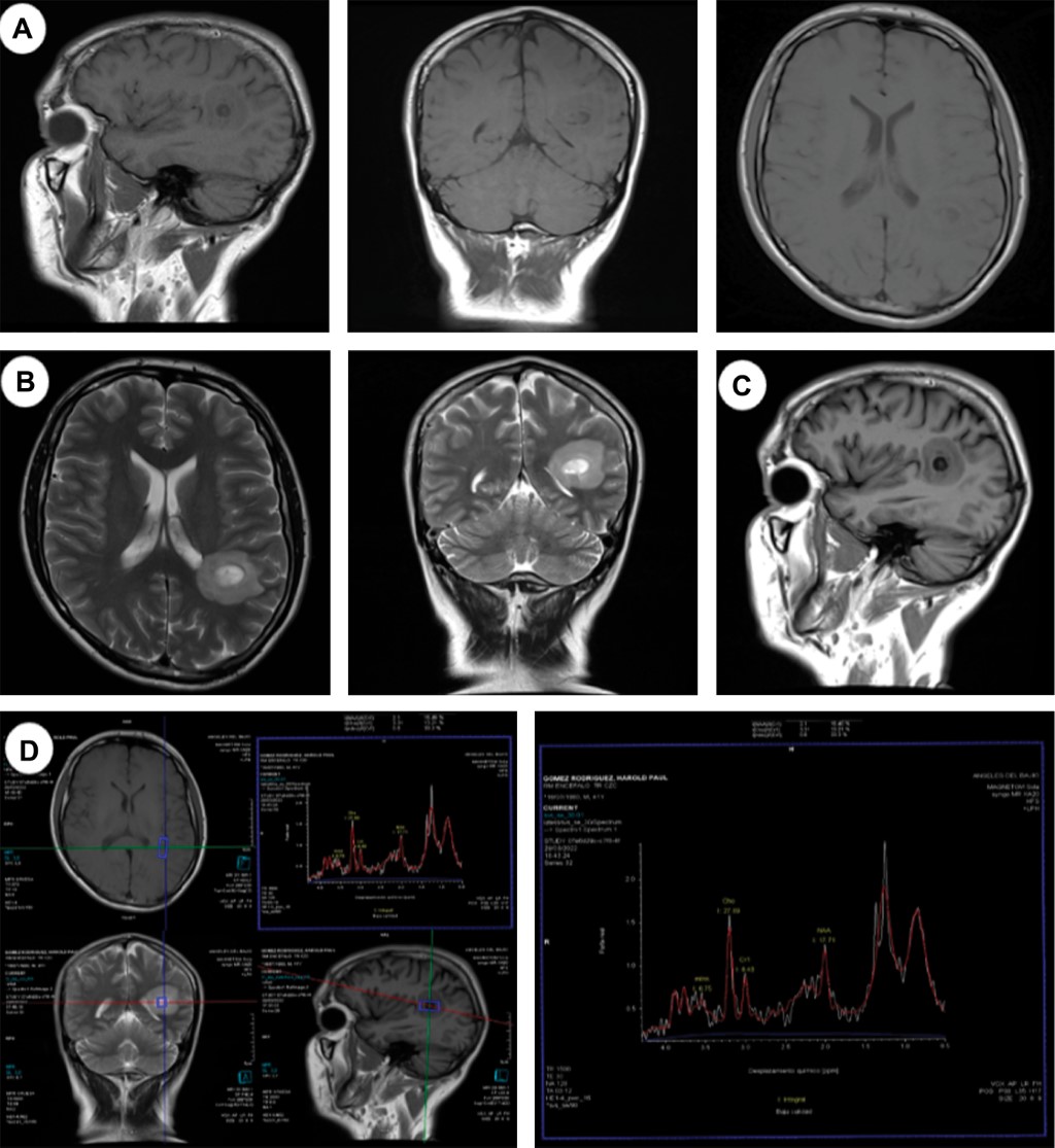 A 41-year-old male patient with a history of traveling to a cave, where he eats raw meat and has poor hygiene conditions. It begins with neurological symptoms, dizziness, dysarthria, difficulty identifying objects, and poor response to medical management. An MRI where a heterogeneous cystic tumor with a mural nodule was found; spectroscopy was performed, showing a lipid peak, suggesting an infectious process. An intervention was performed for stereotaxy, and it was sent to pathology, where they issued us the report of histoplasmosis.REFERENCES