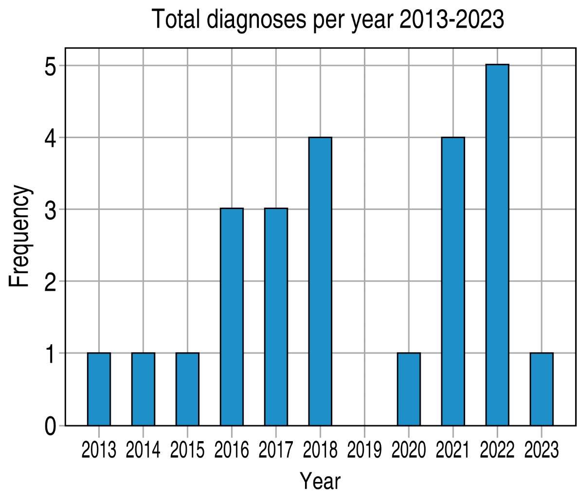 In the study period, the highest incidence was found in 2022, with five cases, 20.8% in relative terms, 16.6% of patients in 2018 and 2021 for each year, and 12.5% in 2016 and 2017. There was no record of cases in 2019, and in the remaining periods, there was only one diagnosed case (Figure 1).