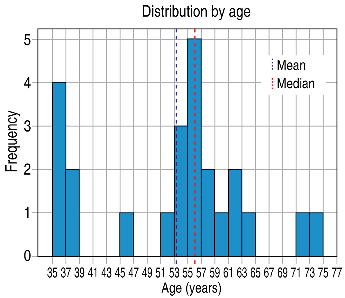 As a numerical variable, a descriptive statistical analysis was performed. The mean age at diagnosis was 53.2 years. The age range was from 35 years to 75 years at its upper limit. The most frequent age of presentation was 56 years, with five cases presented, which coincided with the statistical median and was also close to the average age. The standard deviation was 11.26 years. The second peak was 36 years, with four cases (Figure 2).
