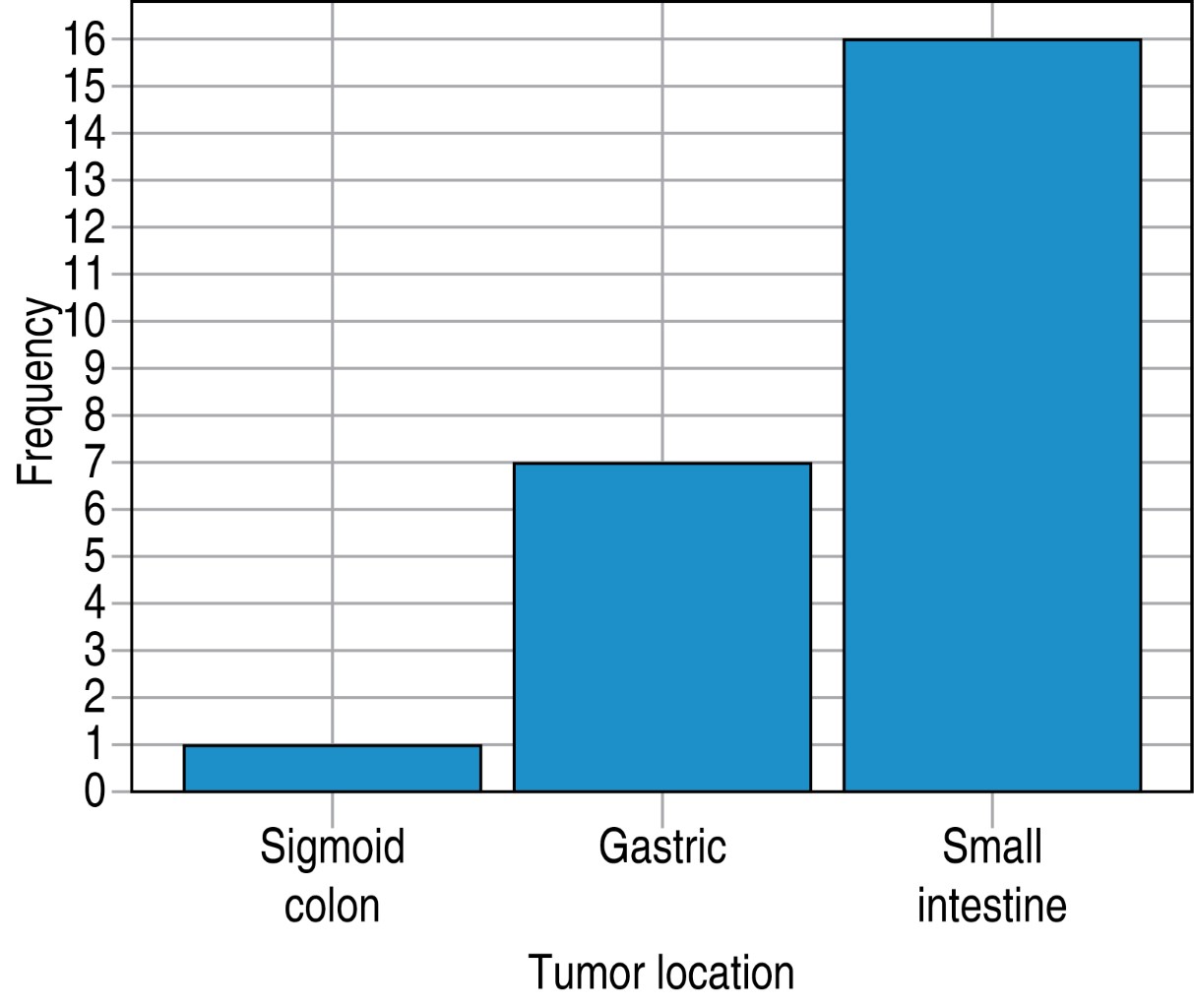 GIST can appear in any part of the gastrointestinal tract, from the esophagus to the rectum, and there are even reports of extraintestinal locations such as the mesentery, omentum, or retroperitoneum. Despite its wide distribution, 50-60% occur in the stomach, 20-30% in the small intestine, 5% in the esophagus, and 5% in the rest of the abdominal cavity. Something worth mentioning in this series is that the highest incidence in its location is intestinal, with 66% in comparison with the gastric area found in 29% and its comparison with what is described in the literature. It is considered that even despite the size, mitotic index, and age of the patient, the location is an important prognostic factor since tumors originating in the small intestine, rectum, or mesentery are associated with a less favorable outcome than those arising in the stomach.10