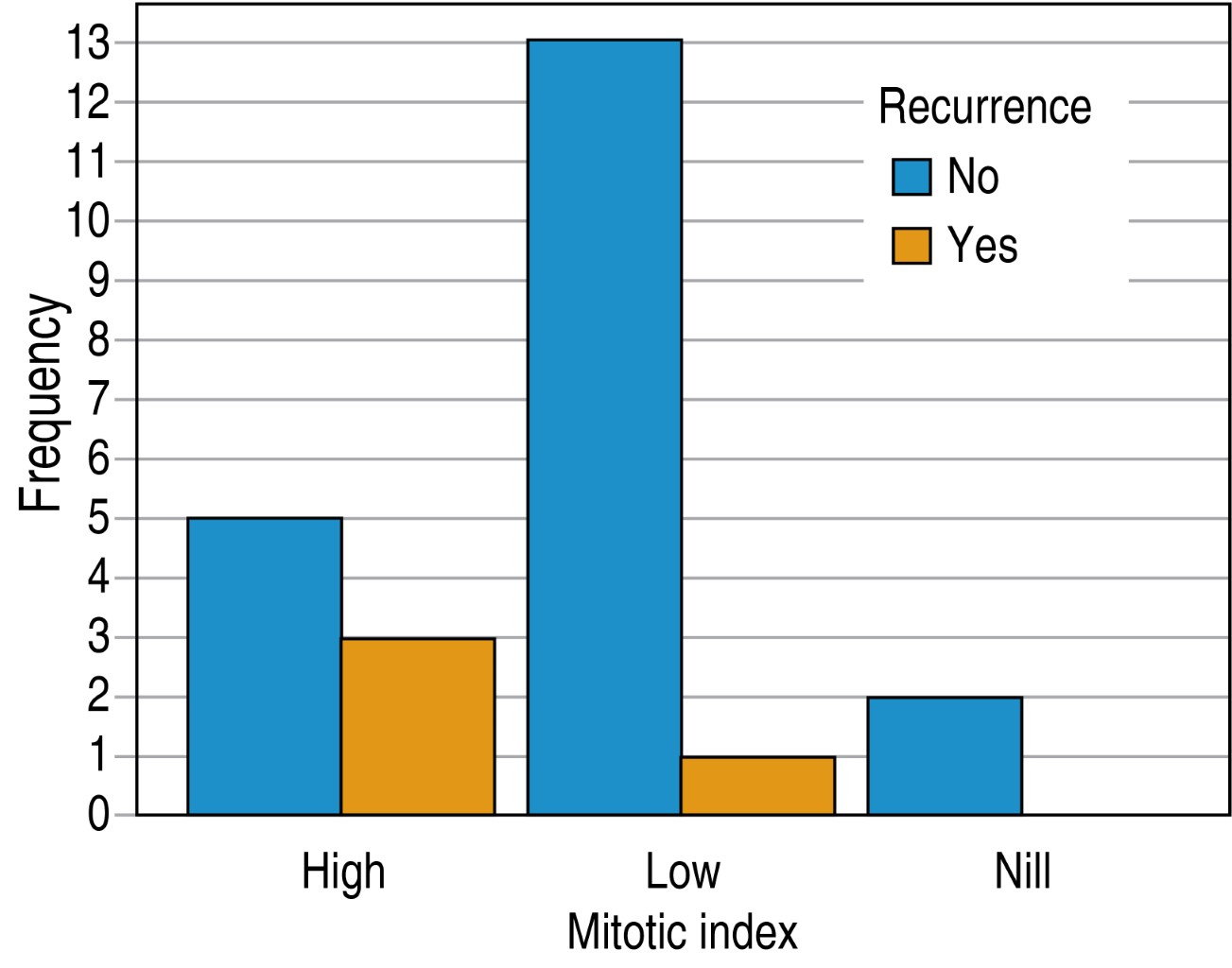 The most frequent mitotic index in this series of cases was low (one to two in 50 fields) at 58%, while at 29%, a high mitotic index was found (> 5 in 20 areas). In turn, 8% showed no mitosis in the histopathologic study.