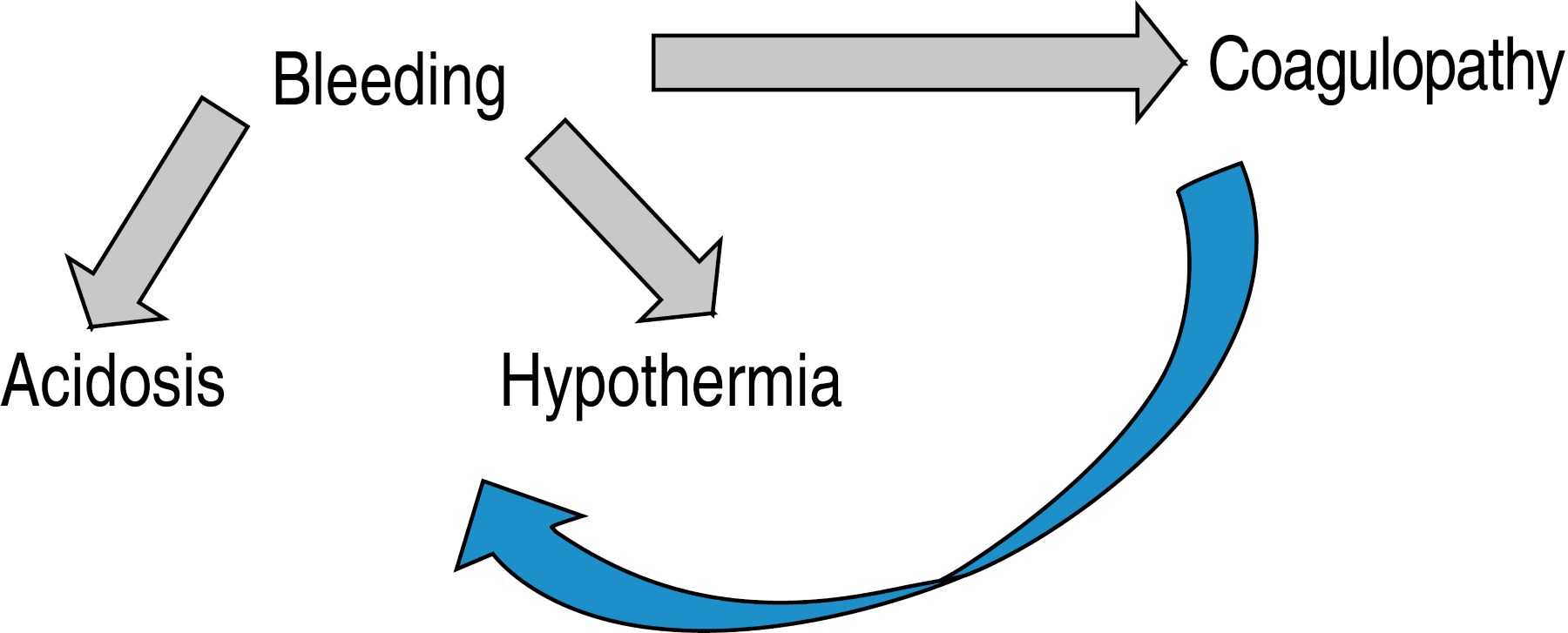 The presence of coagulopathy, hypothermia, and metabolic acidosis, the "deadly triad", was first described by Burch in 1992.12 In a severely injured patient, it carries a mortality risk of up to 90%.7 Uncontrolled bleeding and iatrogenic intravenous therapy result in the development of the lethal triad, leading to a vicious cycle that rapidly triggers death.13