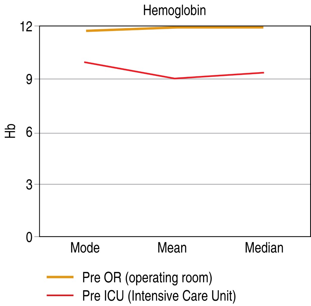For hemoglobin levels in patients undergoing damage control surgery, two measurements were taken from the records, one prior to admission to the Intensive Care Unit with a mean of 9.1 mg/dl and mode of 10 mg/dl, and another measurement prior to the second surgical time or admission to the third stage of damage control surgery, finding a mode of 11.8 mg/dl and a mean of 12 mg/dl as shown in Figure 3.