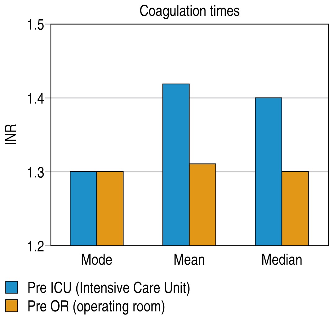 Figure 4 shows the coagulation times measured according to the INR (international normalized ratio), of which two measurements were taken, prior to admission to the Intensive Care Unit, with a mean of 1.42 and a mode of 1.3, and prior to the third stage of damage control surgery, with a mean of 1.31 and a mode of 1.3.