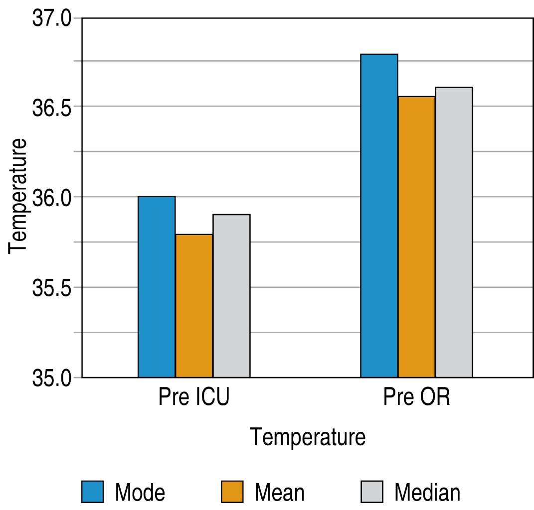 For temperature, two measurements were taken prior to admission to the Intensive Care Unit, which gave a mean of 35.8 degrees Celsius and a mode of 36 degrees Celsius, and another measurement prior to admission to the third stage of damage control surgery with a mode of 36.8 degrees Celsius, a mean of 36.5 degrees Celsius and a median of 36.6 degrees Celsius, as shown in Figure 5.