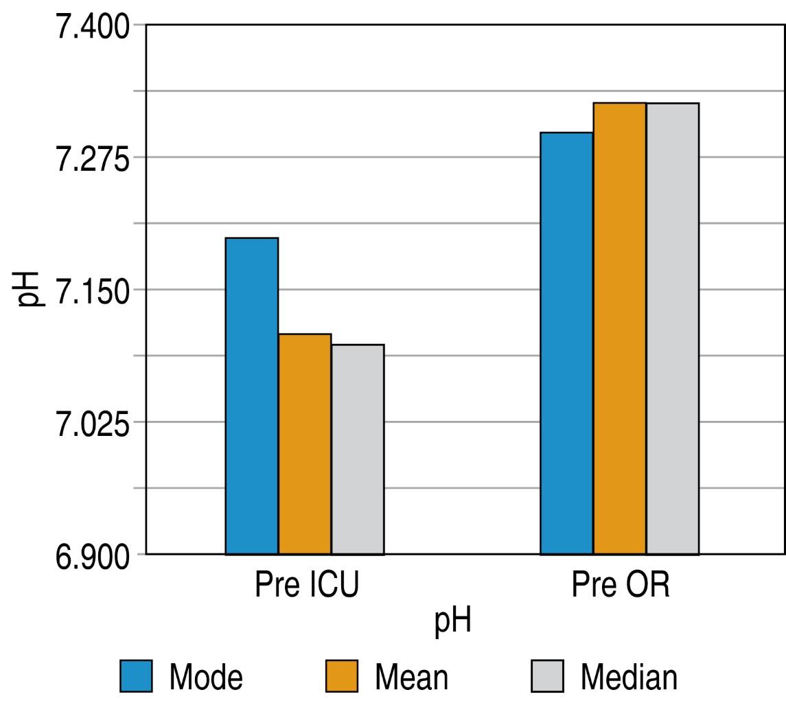 In Figure 6, we can find the pH with which the patients arrived at the Intensive Care Unit with a mode of 7.2 and a mean of 7.1, and the values obtained prior to admission to the third stage of damage control surgery with a mode of 7.3 and a mean of 7.33.