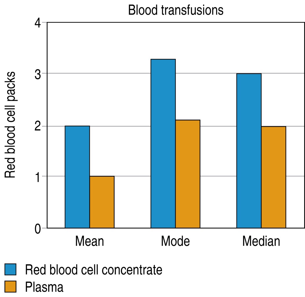 For the number of blood transfusions, a mean of two units of erythrocyte concentrates and one unit of plasma was observed, with a mode of 3.3 units of erythrocyte concentrates and 2.1 units of plasma, as shown in Figure 7.