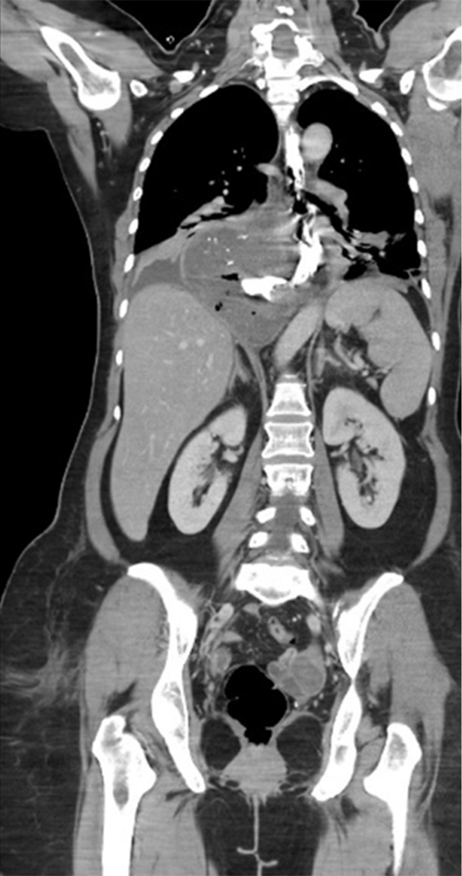 This is the case of a 54-year-old woman with a history of systemic arterial hypertension of 16 years of evolution in medical treatment with losartan 50 mg every 24 hours in reasonable control, history of total abdominal hysterectomy 14 years ago for uterine myomatosis, laparoscopic cholecystectomy four years ago for chronic calculous cholecystitis, both without apparent complications. She started with 36 hours of evolution with significant chest pain, unquantified fever, and attack to her general condition, so she came to our unit for evaluation. When specifically interrogated, she mentioned a history of five years of symptoms characterized by dysphagia to the ingestion of solid food. Physical examination revealed a patient in poor condition with tachycardia of 120 beats per minute, hypotension of 90/60 mmHg, respiratory rate of 23 breaths per minute, temperature of 36.5 °C, and generalized pallor of the integuments. The auscultation of the chest on the right side revealed decreased breath sounds with dullness to percussion. Her abdomen was flat, soft, and depressible with increased vocal vibrations, with no evidence of peritoneal irritation. Laboratory tests showed hemoglobin 16.6 g/dl, hematocrit 49.68%, white blood cells 18 cells/mm3, and neutrophils 89%. A thoracoabdominal tomography was performed, which showed a distal esophagus-dependent tumor associated with free fluid in the thorax and exit of contrast medium from the esophageal lumen (Figures 1 and 2). Due to the clinical picture of esophageal perforation and mediastinitis, it was decided to submit the patient to surgical treatment.