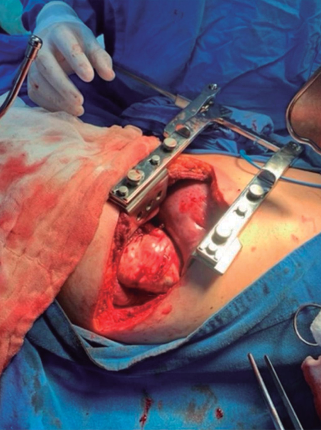 A diagnostic right posterolateral thoracotomy was performed, documenting a tumor dependent on the esophagus in its distal third with perforation of the latter, so esophagectomy was performed resecting the distal end of the esophagus using a blue cartridge linear stapler (Figure 3), with a subsequent longitudinal dissection of the esophagus. During a second surgical time, a left cervical approach was used to exteriorize the esophagus and prepare an esophagostoma, maturing it with 2-0 polyglactin 910 stitches. The cervical and thoracic wound was closed by planes, the latter after placement of two endo pleural probes number 18 Fr. A third surgical stage was done for preparing a Witzel-type feeding jejunostomy. No drains were left in the abdominal cavity, and the patient left the operating room with medical treatment based on antibiotic therapy with meropenem 1 gram intravenously every eight hours. The patient had a favorable clinical evolution; the endo pleural tubes were removed on the second postoperative day, and a homemade diet was started through a jejunostomy tube. The patient was discharged on the fifth postoperative day.