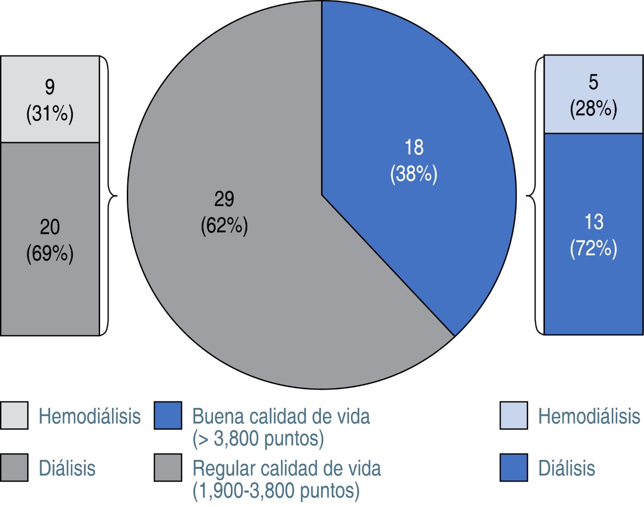 Results: of the total, 38.3% (n = 18) were classified as having good QoL. However, there was no difference between HD and DPA, since the global QoL score had a median of 3.633 and 3.379, respectively (p = 0.136). But, in the domains of physical activity and personal time, HD patients had lower scores (p < 0.05).