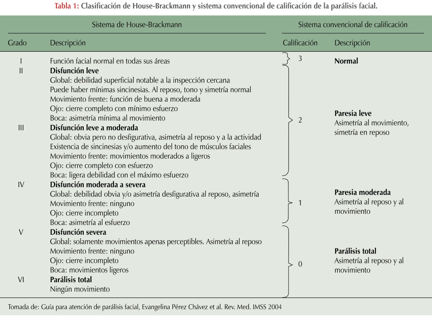 Pérez Chávez E, Gámez Martínez C, Guzmán González JM, Escobar Rodríguez D, López Roldán VM, Montes de Oca RD et al. Guía clínica para la rehabilitación del paciente con parálisis facial periférica. Rev Med IMSS. 2004; 42 (5): 425-436.