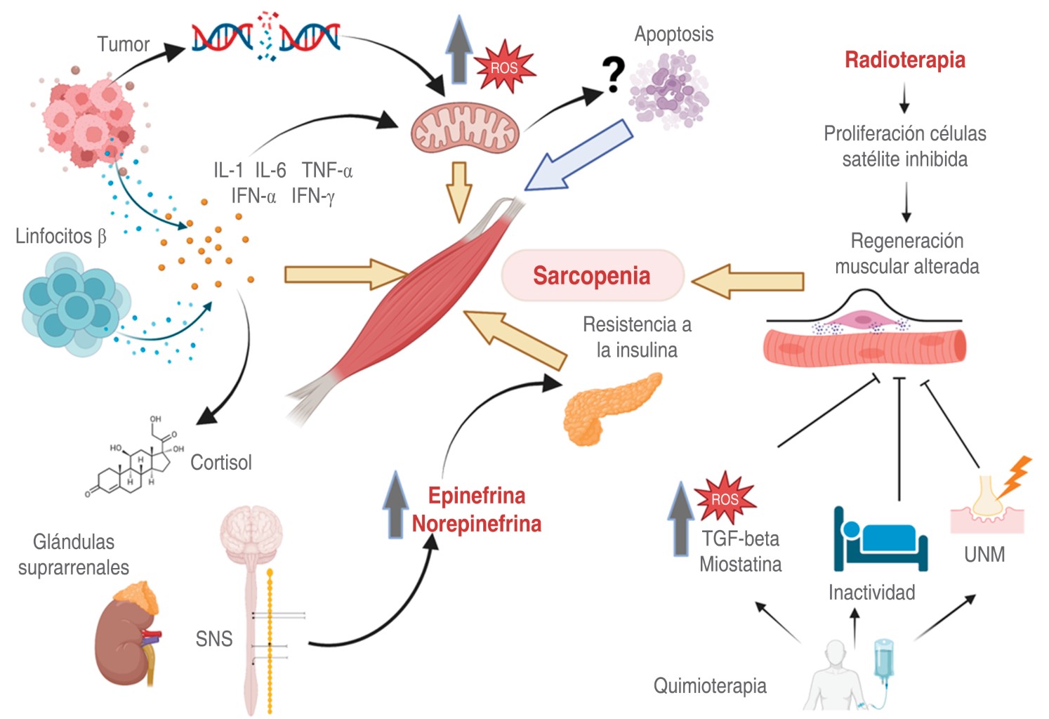 The muscle has very important interrelationships with other organs such as the heart, liver, brain and adipose tissue. Its wear, known as sarcopenia, has been associated with different types of cancer during treatment, which causes an increase in toxicity derived from both, chemotherapy and radiotherapy. This causes treatment delays and unwanted dose adjustments that negatively impact the survival of cancer patients. There is evidence that suggests that sarcopenia persists even in the survival stage, conditioning a negative impact on the quality of life of patients and on their work productivity. Different physiopathological mechanisms at the cellular and molecular level involved in sarcopenia in cancer are known, which increasingly show a bidirectional relationship, both positive and negative, between cancer and muscle.