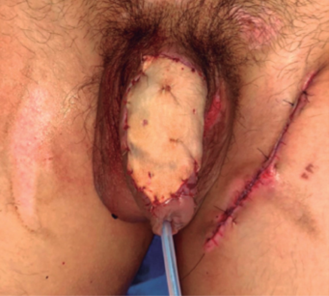 Penile skin loss can occur after a variety of pathological processes, such as severe genital burns, genital lymphedema, soft tissue infection, and excessive skin removal after debridement.7 This results in severe functional and aesthetic disability for the patient, which can have a significant impact on their quality of life, requiring an individualized reconstructive surgical technique focused on the particular conditions of each patient.4 Skin coverage options include partial or full-thickness skin grafts, fascio-cutaneous flaps, pedicled flaps, microsurgical reconstruction, or a combination of these.2