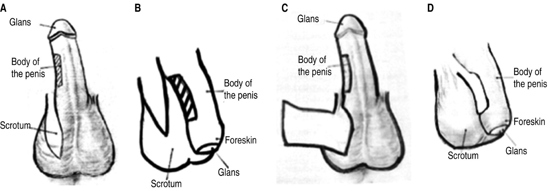 The goals for successful reconstruction in patients with penile shaft burns require tension-free surgical repair to allow sufficient length, adequate skin for unrestricted erections to allow acceptable sexual function, protective sensitivity to prevent chronic skin degeneration, ability to empty the corpora cavernosa spontaneously while standing, minimize tissue loss, maintain adequate penile shaft thickness, preserve voluntary urination, avoid scar retraction and present a good aesthetic appearance.3