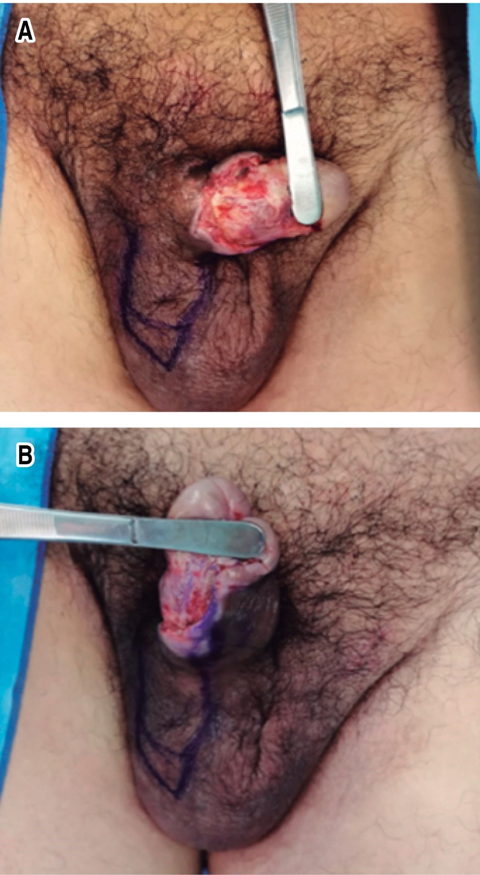 In the second clinical case, a scrotal flap was performed, which allowed adequate skin coverage with skin identical to the injured skin and without leaving a residual skin defect.5 A base was designed with vascular contribution from the external pudendal artery; subsequently, the dissection of the flap was performed, which allowed the advancement in the form of a book page over the resulting skin defect in the penile shaft; mummification of the most distal part of the flap was performed so that it ended in a point, this configuration allowed skin coverage with tissue of similar diameter, color and sensitivity to the defect, and avoided the appearance of scar contracture.6 In the literature review, we have not found any reported cases of scrotal flaps with modifications of the tip design.7 Scrotal flaps provide a similar reconstruction with donor tissue, and a tension-free repair can be performed without increasing days of hospitalization and with minimal sequelae in the donor area.8 Compared to skin grafting, the scrotal skin flap has several advantages, such as skin texture, less shrinkage, and better elasticity during an erection. However, little has been published on scrotal skin flaps covering severe skin defects. Pedicled flaps from adjacent areas, such as the groin, represent a reconstructive option with good sensory function and adequate vascularization. These characteristics allow the penis to regain its strength and elasticity but report drawbacks with scarring of the donor site and excessive bulging of the tissue in the recipient site.9